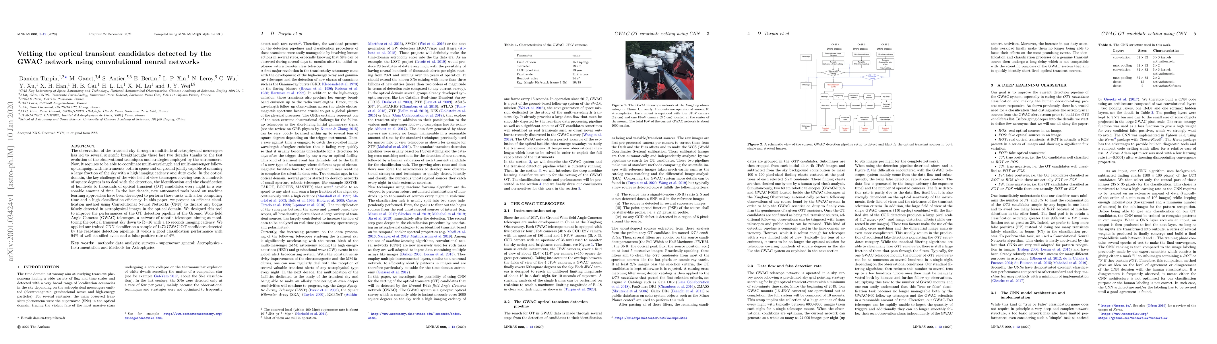 A new classification method using Convolutional Neural Networks improves the detection pipeline of GWAC telescopes, yielding 94% accurate event classifications with a false positive rate of 4%.