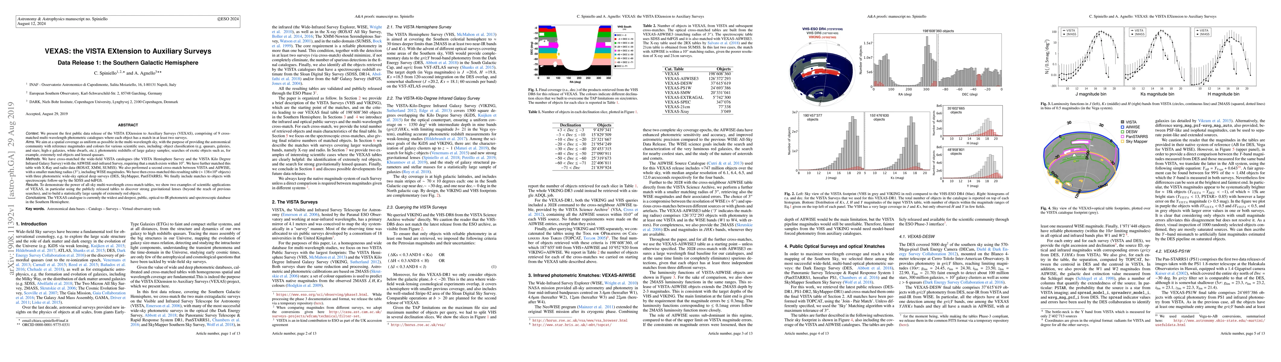 We present the first public data release of the VISTA EXtension to Auxiliary Surveys (VEXAS), comprising of 9 cross-matched multi-wavelength photometric catalogs where each object has a match in at least two surveys. We aim at a spatial coverage as uniform as possible in the multi-wavelength sky, with the purpose of providing the astronomical community with reference magnitudes and colours for various scientific uses, including: object classification (e.g. quasars, galaxies, and stars; high-z galaxies, white dwarfs, etc.); photometric redshifts of large galaxy samples; searches of exotic objects such as, for example, extremely red objects and lensed quasars. We have cross-matched the wide-field VISTA catalogs (the VISTA Hemisphere Survey and the VISTA Kilo Degree Infrared Galaxy Survey) with the AllWISE mid-infrared Survey, requiring that a match exists within 10 arcsec. We have further matched this table with X-Ray and radio data (ROSAT, XMM, SUMSS). We also performed a second cross-match between VISTA and AllWISE, with a smaller matching radius (3"), including WISE magnitudes. We have then cross-matched this resulting table ($\approx138\times10^6$ objects) with three photometric wide-sky optical deep surveys (DES, SkyMapper, PanSTARRS). We finally include matches to objects with spectroscopic follow-up by the SDSS and 6dFGS. To demonstrate the power of all-sky multi-wavelength cross-match tables, we show two examples of scientific applications of VEXAS, in particular using the publicly released tables to discover strong gravitational lenses (beyond the reach of previous searches), and to build a statistically large sample of extremely red objects. The VEXAS catalog is currently the widest and deepest, public, optical-to-IR photometric and spectroscopic database in the Southern Hemisphere.