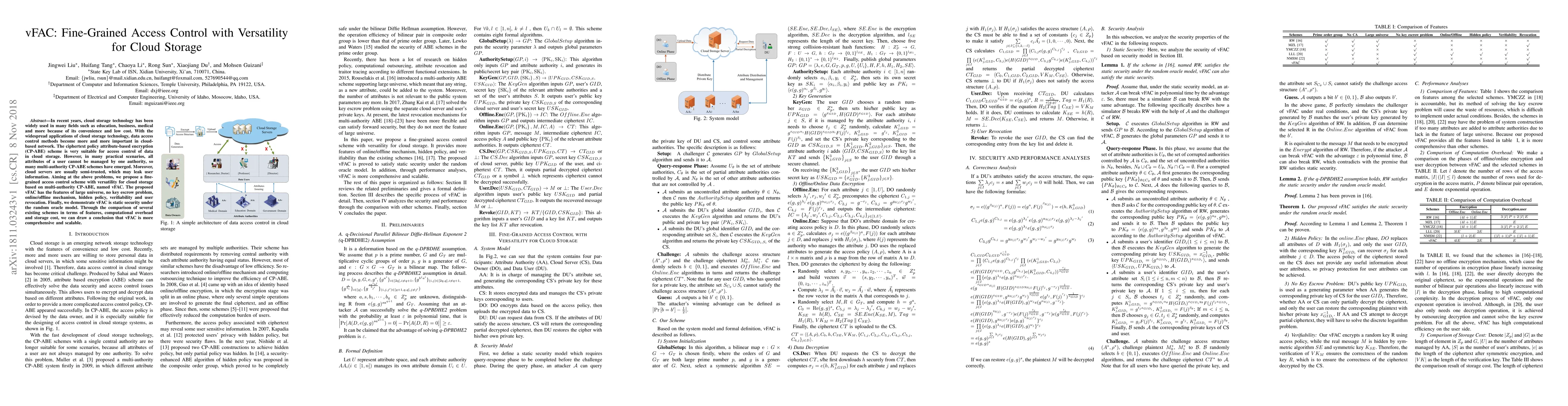 The paper proposes vFAC, a versatile fine-grained access control scheme for cloud storage based on multi-authority CP-ABE, addressing issues like attribute management and semi-trusted cloud servers. vFAC features large universe, no key escrow, online/offline mechanism, hidden policy, verifiability, and user revocation, and is shown to be statically secure under the random oracle model, outperforming existing schemes in comprehensiveness and scalability.