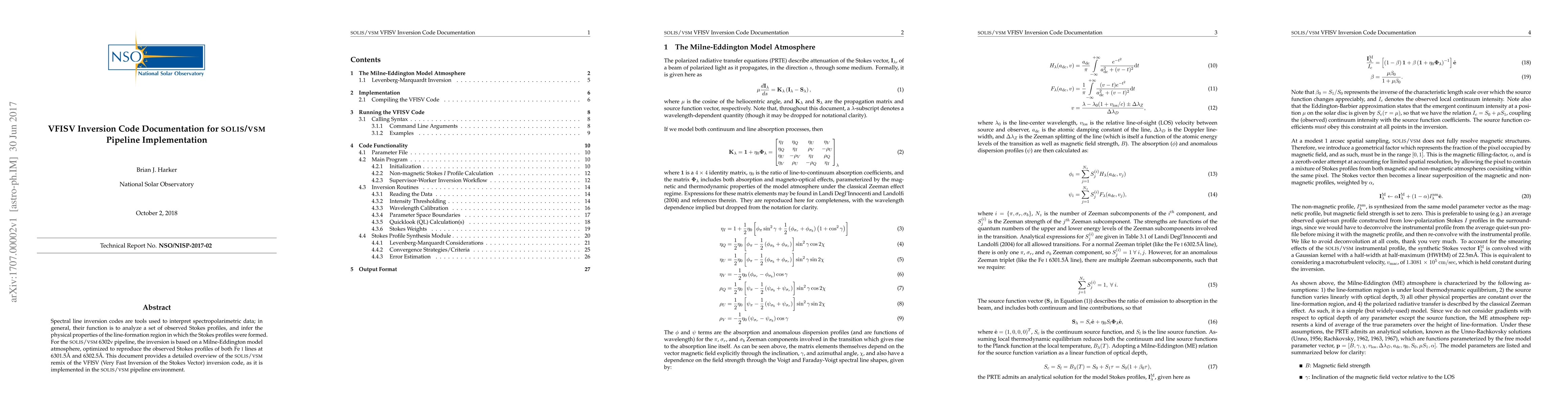 This paper documents the implementation of the VFISV inversion code within the SOLIS/VSM pipeline for analyzing spectropolarimetric data. It focuses on optimizing the Milne-Eddington model atmosphere to reproduce observed Stokes profiles of Fe I lines at 6301.5 and 6302.5 Angstroms.