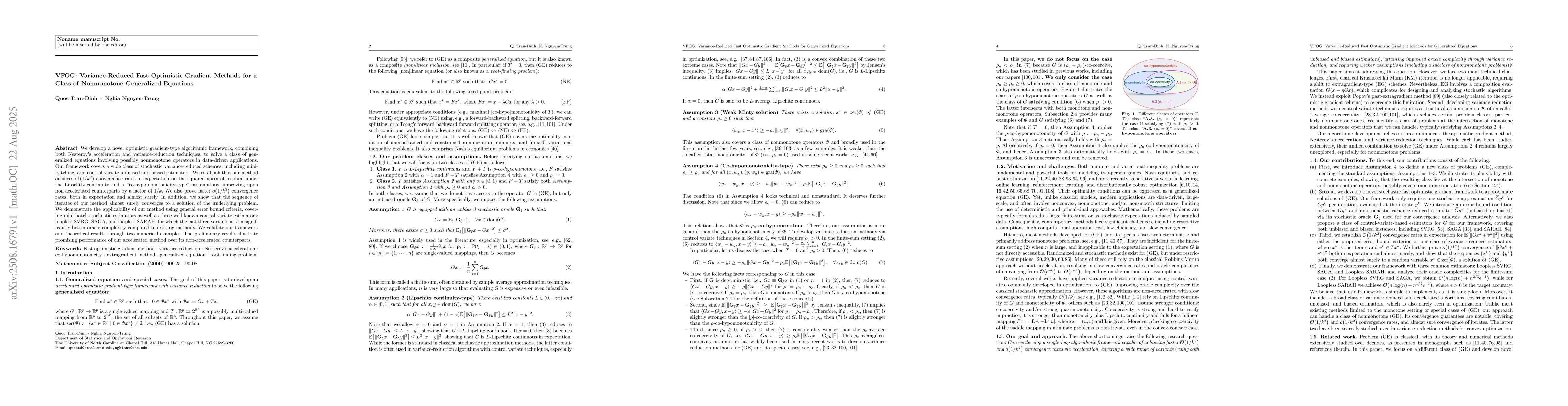 We develop a novel optimistic gradient-type algorithmic framework, combining both Nesterov's acceleration and variance-reduction techniques, to solve a class of generalized equations involving possibly nonmonotone operators in data-driven applications. Our framework covers a wide class of stochastic variance-reduced schemes, including mini-batching, and control variate unbiased and biased estimators. We establish that our method achieves $\mathcal{O}(1/k^2)$ convergence rates in expectation on the squared norm of residual under the Lipschitz continuity and a ``co-hypomonotonicity-type'' assumptions, improving upon non-accelerated counterparts by a factor of $1/k$. We also prove faster $o(1/k^2)$ convergence rates, both in expectation and almost surely. In addition, we show that the sequence of iterates of our method almost surely converges to a solution of the underlying problem. We demonstrate the applicability of our method using general error bound criteria, covering mini-batch stochastic estimators as well as three well-known control variate estimators: loopless SVRG, SAGA, and loopless SARAH, for which the last three variants attain significantly better oracle complexity compared to existing methods. We validate our framework and theoretical results through two numerical examples. The preliminary results illustrate promising performance of our accelerated method over its non-accelerated counterparts.