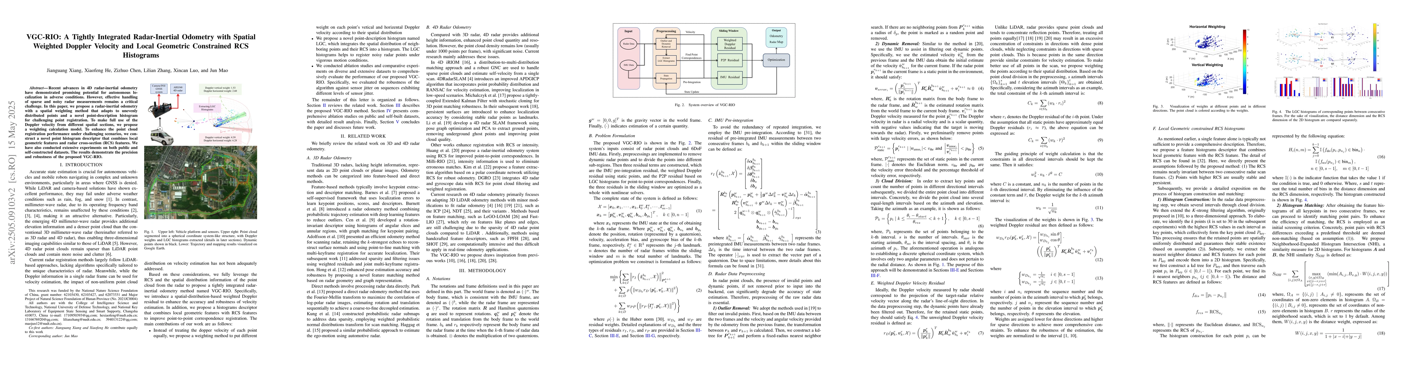 The research proposes a radar-inertial odometry (VGC-RIO) that integrates spatial weighted Doppler velocity and local geometric constrained RCS histograms for effective handling of sparse and noisy radar measurements in autonomous localization.
