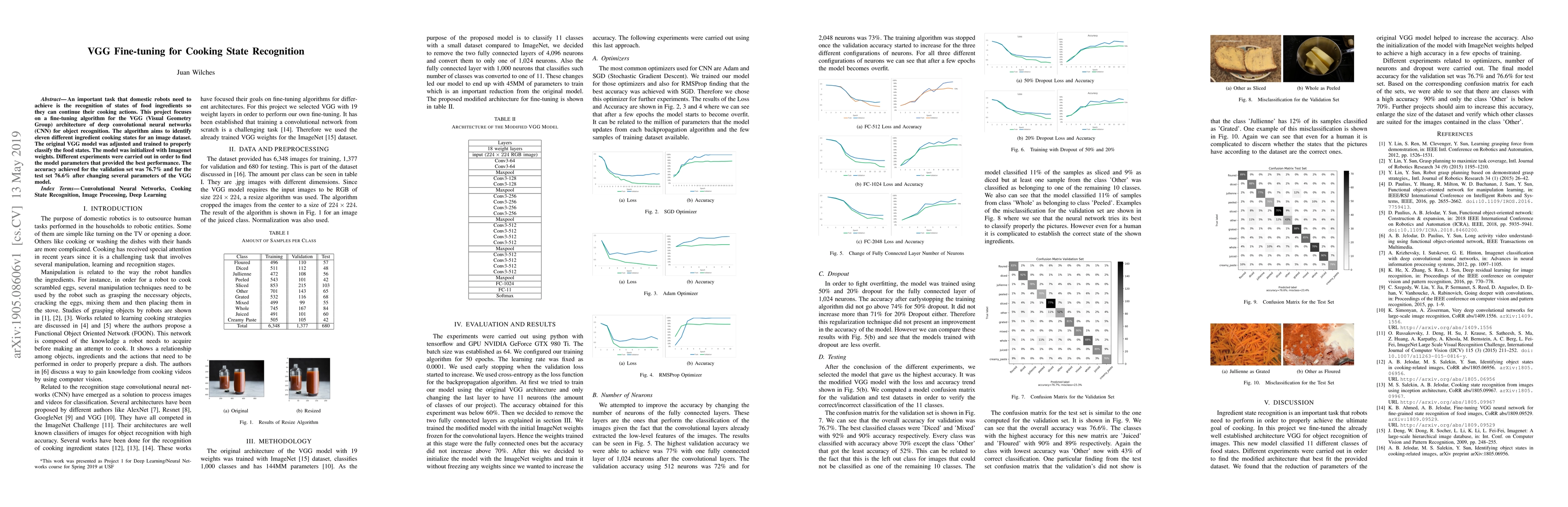 This research fine-tunes the VGG architecture of deep CNNs to recognize eleven cooking states of food ingredients for domestic robots. After adjusting the model with ImageNet weights and optimizing parameters, the fine-tuned VGG achieved 76.7% accuracy on the validation set and 76.6% on the test set.