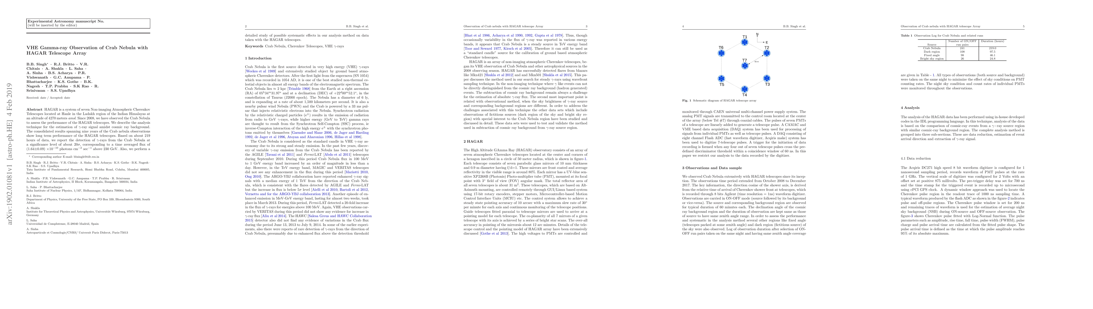 The HAGAR telescope array, located in the Indian Himalayas, observed the Crab Nebula for nine years, detecting VHE gamma-rays with a 20$sigma$ significance. The time-averaged flux above 230 GeV was measured as (1.64$pm$0.09) $ imes10^{-10}$ photons cm$^{-2}$ sec$^{-1}$, with a study of systematic effects in the analysis method.