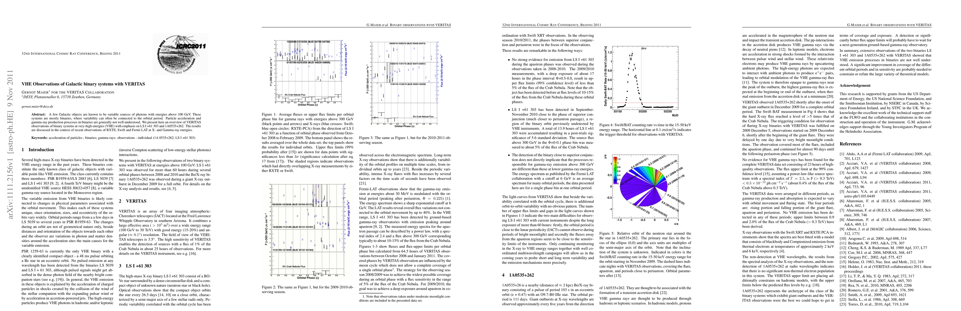 This paper reviews VERITAS observations of high-energy gamma-ray emissions from Galactic binary systems, focusing on LS I +61 303 and 1A0535+262, and discusses these findings in conjunction with recent X-ray and gamma-ray data from RXTE, Swift, and Fermi LAT.
