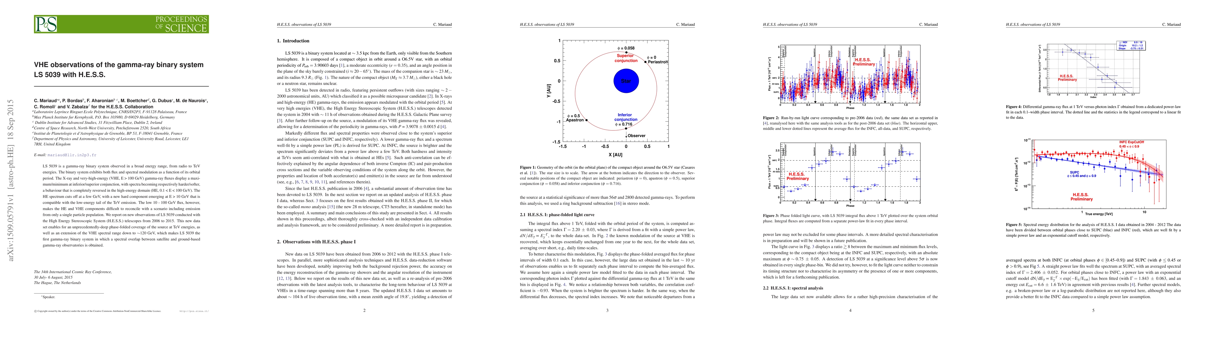 The H.E.S.S. observations of the gamma-ray binary system LS 5039 reveal complex modulation in both flux and spectral characteristics across different energy ranges, with a spectral overlap between satellite and ground-based observatories at TeV energies. The new data set extends the VHE spectral range down to ~120 GeV, challenging the notion of a single particle population for the observed emissions.