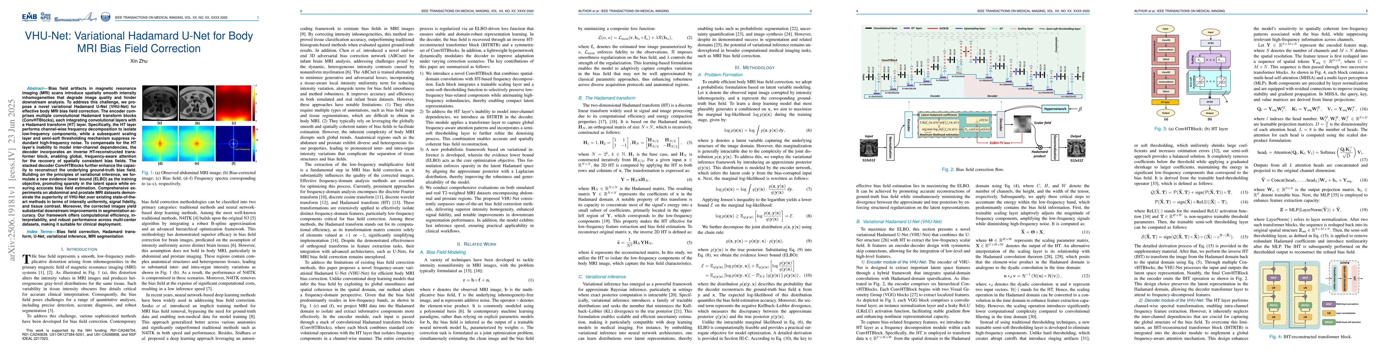 Bias field artifacts in magnetic resonance imaging (MRI) scans introduce spatially smooth intensity inhomogeneities that degrade image quality and hinder downstream analysis. To address this challenge, we propose a novel variational Hadamard U-Net (VHU-Net) for effective body MRI bias field correction. The encoder comprises multiple convolutional Hadamard transform blocks (ConvHTBlocks), each integrating convolutional layers with a Hadamard transform (HT) layer. Specifically, the HT layer performs channel-wise frequency decomposition to isolate low-frequency components, while a subsequent scaling layer and semi-soft thresholding mechanism suppress redundant high-frequency noise. To compensate for the HT layer's inability to model inter-channel dependencies, the decoder incorporates an inverse HT-reconstructed transformer block, enabling global, frequency-aware attention for the recovery of spatially consistent bias fields. The stacked decoder ConvHTBlocks further enhance the capacity to reconstruct the underlying ground-truth bias field. Building on the principles of variational inference, we formulate a new evidence lower bound (ELBO) as the training objective, promoting sparsity in the latent space while ensuring accurate bias field estimation. Comprehensive experiments on abdominal and prostate MRI datasets demonstrate the superiority of VHU-Net over existing state-of-the-art methods in terms of intensity uniformity, signal fidelity, and tissue contrast. Moreover, the corrected images yield substantial downstream improvements in segmentation accuracy. Our framework offers computational efficiency, interpretability, and robust performance across multi-center datasets, making it suitable for clinical deployment.