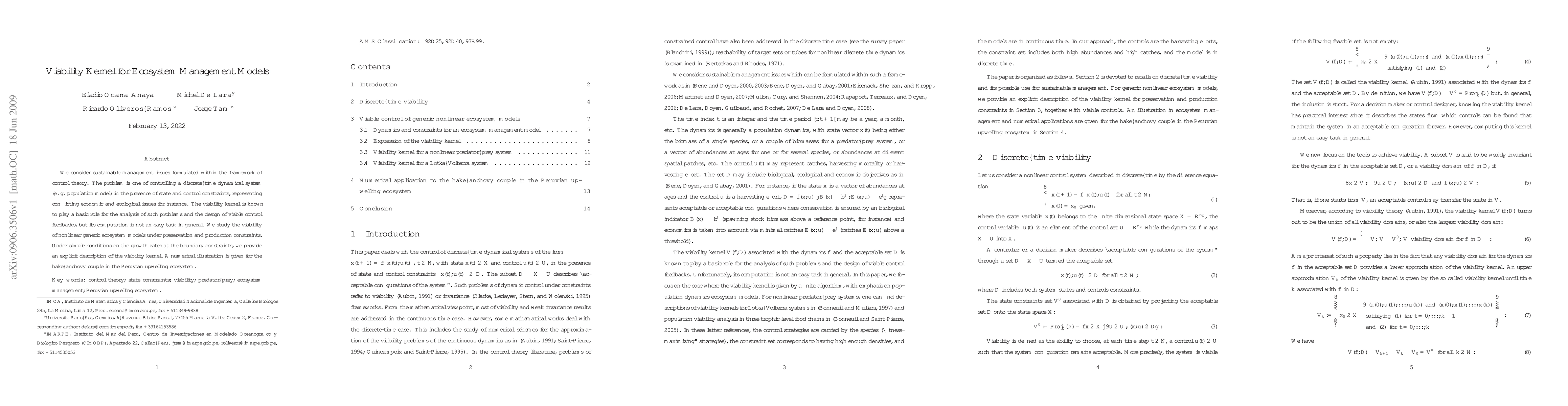 This paper explores sustainable management of ecosystem models using control theory, focusing on the computation of the viability kernel to ensure system viability under constraints. It provides an explicit description of the viability kernel for nonlinear ecosystem models and demonstrates its application through a numerical example of the hake-anchovy system in the Peruvian upwelling ecosystem.
