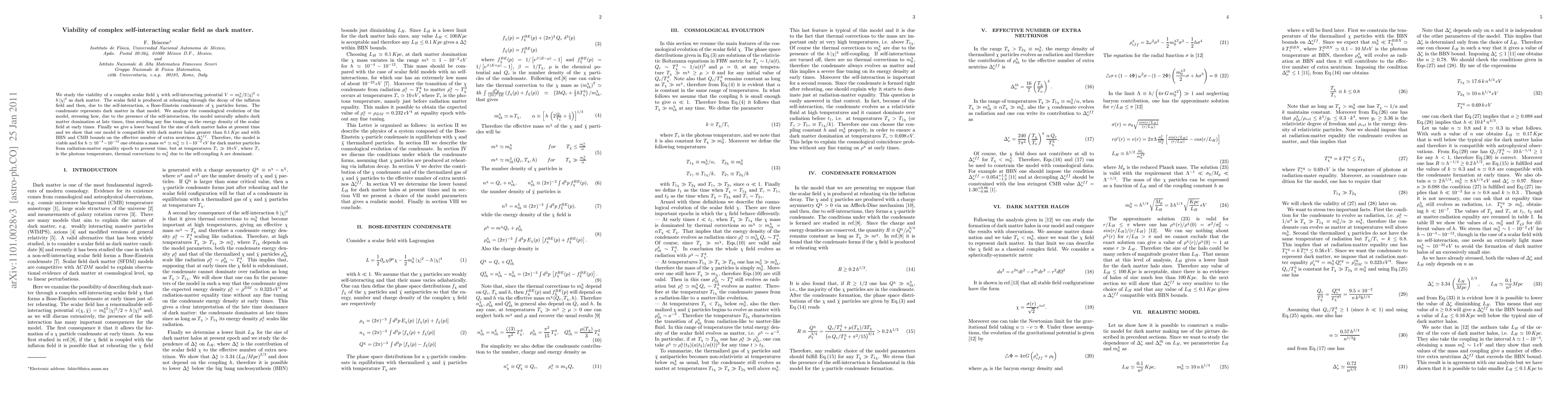 We study the viability of a complex scalar field $\chi$ with self-interacting potential $ V = m^\chi_0/2 \, |\chi|^2 + h \, |\chi|^4$ as dark matter. The scalar field is produced at reheating through the decay of the inflaton field and then, due to the self-interaction, a Bose-Einstein condensate of $\chi$ particles forms. The condensate represents dark matter in that model. We analyze the cosmological evolution of the model, stressing how, due to the presence of the self-interaction, the model naturally admits dark matter domination at late times, thus avoiding any fine tuning on the energy density of the scalar field at early times. Finally we give a lower bound for the size of dark matter halos at present time and we show that our model is compatible with dark matter halos greater than $0.1 \, Kpc$ and with BBN and CMB bounds on the effective number of extra neutrinos $\Delta_\nu^{eff}$. Therefore, the model is viable and for $h\simeq 10^{-4}-10^{-12}$ one obtains a mass $m^\chi \simeq m^{\chi}_0 \simeq 1-10^{-2} \, eV$ for dark matter particles from radiation-matter equality epoch to present time, but at temperatures $T_\gamma \gg 10 \, eV$, where $T_\gamma$ is the photons temperature, thermal corrections to $m^\chi_0$ due to the self-coupling $h$ are dominant.