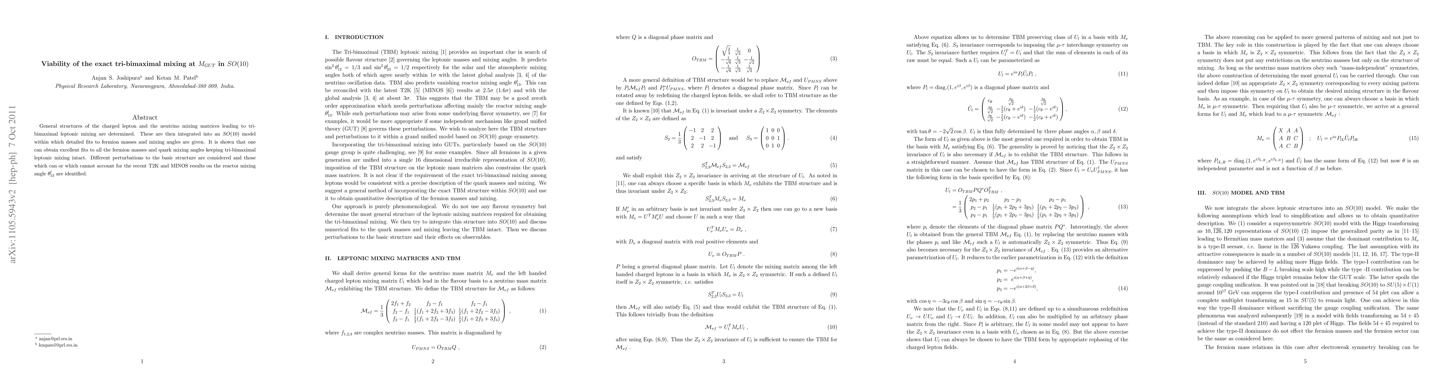 This paper explores the exact tri-bimaximal mixing in the context of SO(10) models, demonstrating its viability at M_{GUT} through detailed fits to fermion masses and mixing angles. It also investigates perturbations to maintain tri-bimaximal mixing while accounting for recent experimental results on the reactor mixing angle $\theta_{13}^l$.