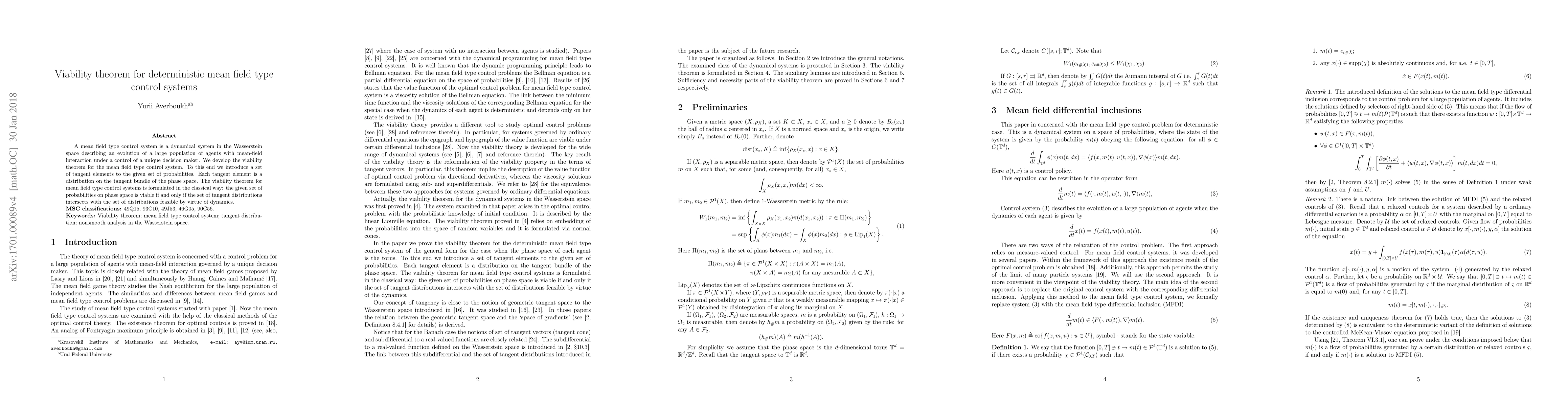 The paper develops a viability theorem for mean field type control systems, which describe the evolution of a large population of agents under a unique decision maker's control. The theorem establishes conditions under which the given set of probabilities remains viable by ensuring the intersection of tangent distributions with feasible distributions dictated by system dynamics.
