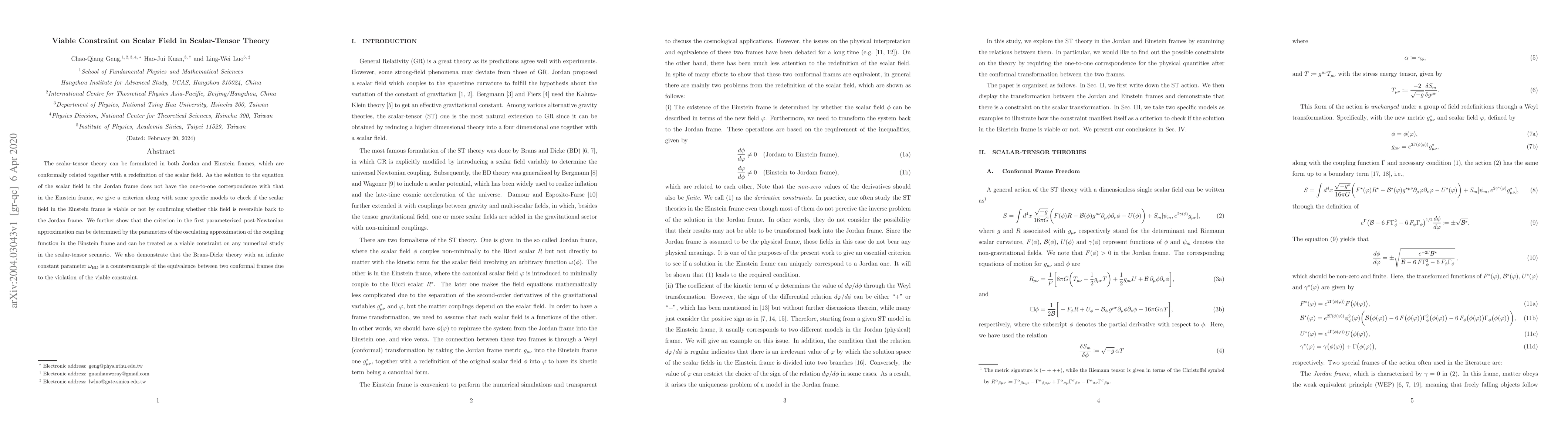 A study investigates a constraint on scalar fields in scalar-tensor theory, determining viability via reversibility between Jordan and Einstein frames, with implications for numerical studies of scalar-tensor scenarios.