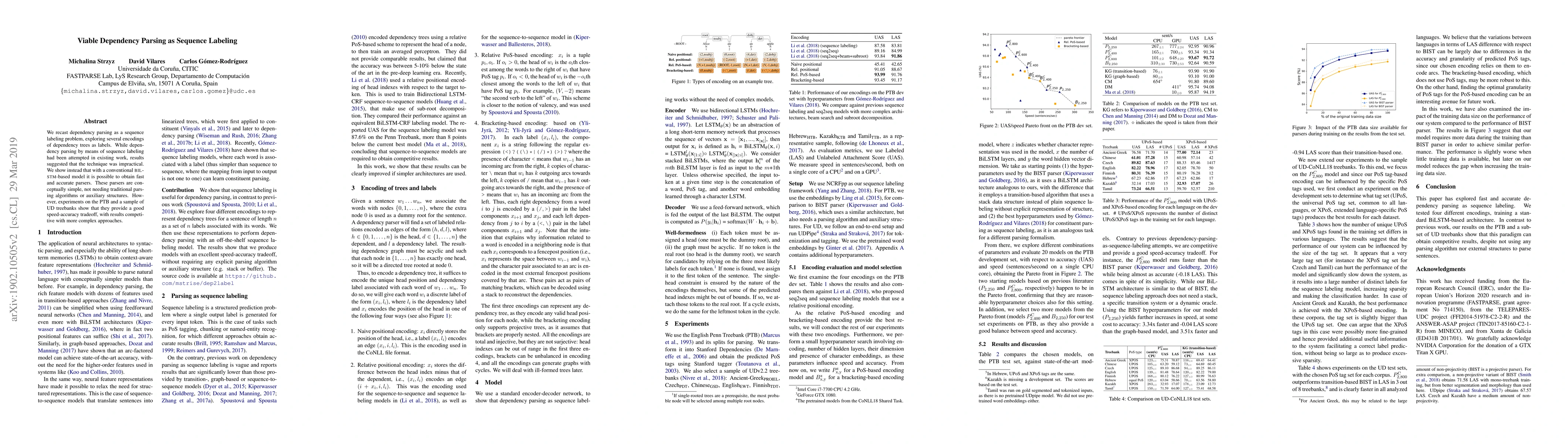 This paper recasts dependency parsing as a sequence labeling task, demonstrating that a BiLSTM-based model can achieve fast and accurate parsing results. The proposed method offers a good speed-accuracy tradeoff and competitive performance compared to more complex parsing techniques.