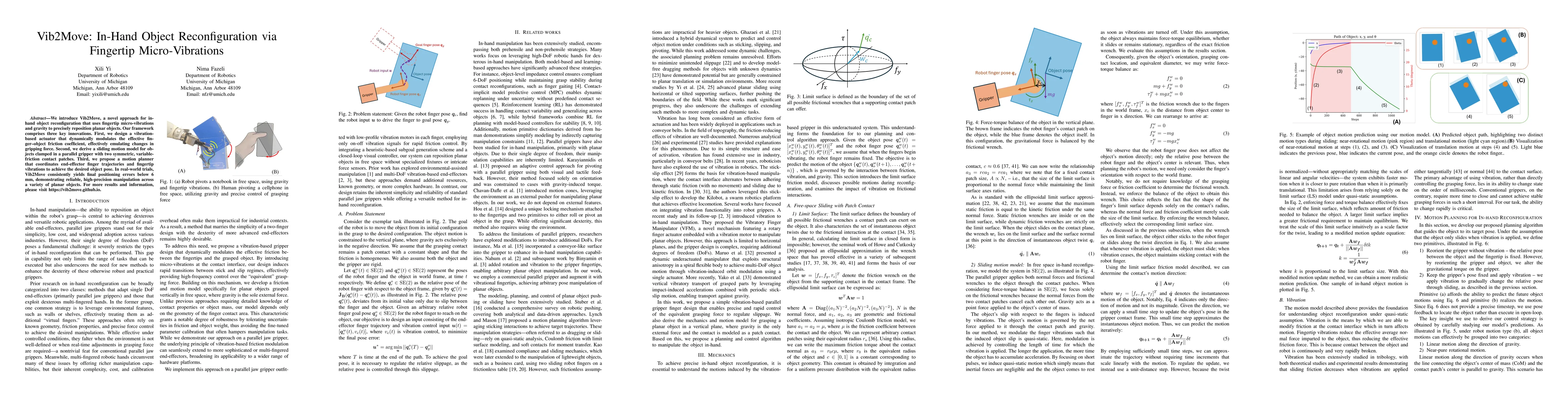 A new approach called Vib2Move uses fingertip micro-vibrations to precisely reposition planar objects, achieving final positioning errors of less than 6 mm in real-world trials.