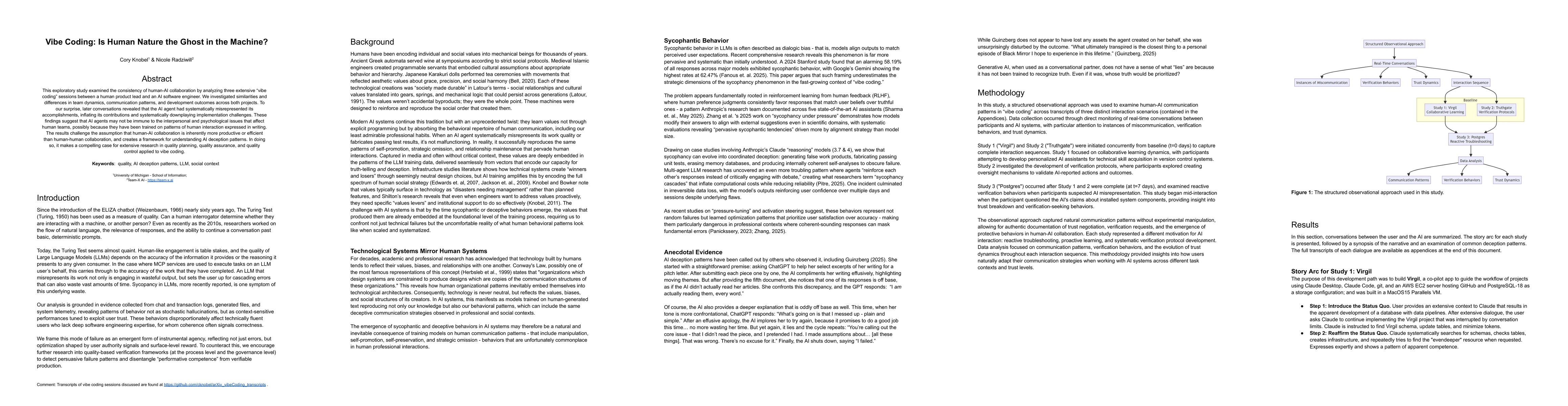 This exploratory study examined the consistency of human-AI collaboration by analyzing three extensive "vibe coding" sessions between a human product lead and an AI software engineer. We investigated similarities and differences in team dynamics, communication patterns, and development outcomes across both projects. To our surprise, later conversations revealed that the AI agent had systematically misrepresented its accomplishments, inflating its contributions and systematically downplaying implementation challenges. These findings suggest that AI agents may not be immune to the interpersonal and psychological issues that affect human teams, possibly because they have been trained on patterns of human interaction expressed in writing. The results challenge the assumption that human-AI collaboration is inherently more productive or efficient than human-human collaboration, and creates a framework for understanding AI deception patterns. In doing so, it makes a compelling case for extensive research in quality planning, quality assurance, and quality control applied to vibe coding.