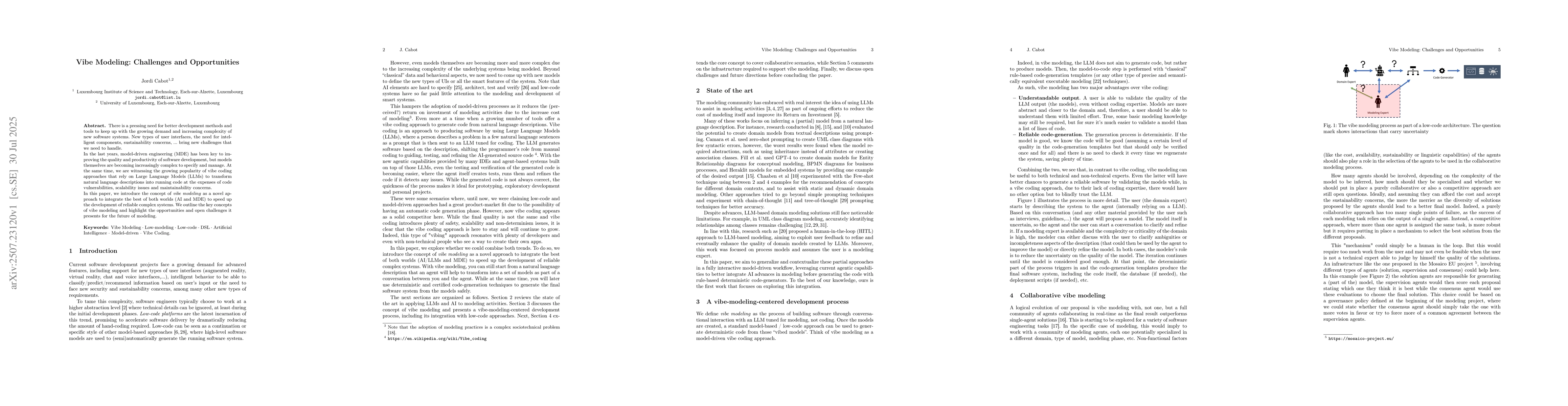 There is a pressing need for better development methods and tools to keep up with the growing demand and increasing complexity of new software systems. New types of user interfaces, the need for intelligent components, sustainability concerns, ... bring new challenges that we need to handle. In the last years, model-driven engineering (MDE) has been key to improving the quality and productivity of software development, but models themselves are becoming increasingly complex to specify and manage. At the same time, we are witnessing the growing popularity of vibe coding approaches that rely on Large Language Models (LLMs) to transform natural language descriptions into running code at the expenses of code vulnerabilities, scalability issues and maintainability concerns. In this paper, we introduce the concept of \textit{vibe modeling} as a novel approach to integrate the best of both worlds (AI and MDE) to speed up the development of reliable complex systems. We outline the key concepts of vibe modeling and highlight the opportunities and open challenges it presents for the future of modeling.