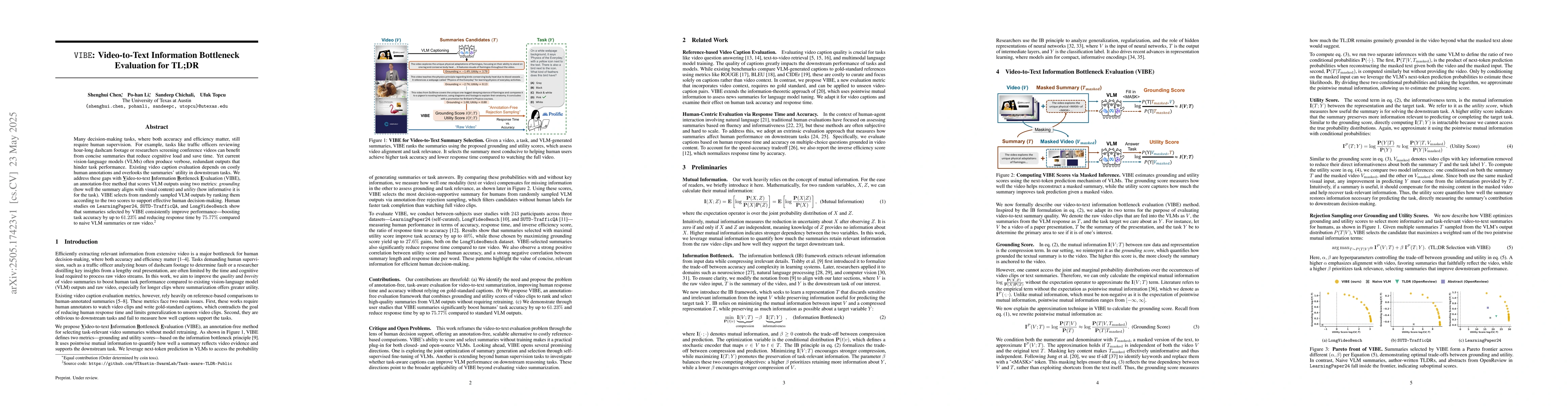The research introduces Video-to-text Information Bottleneck Evaluation (VIBE), an annotation-free method that scores VLM outputs using grounding and utility metrics to select summaries for human decision-making tasks.