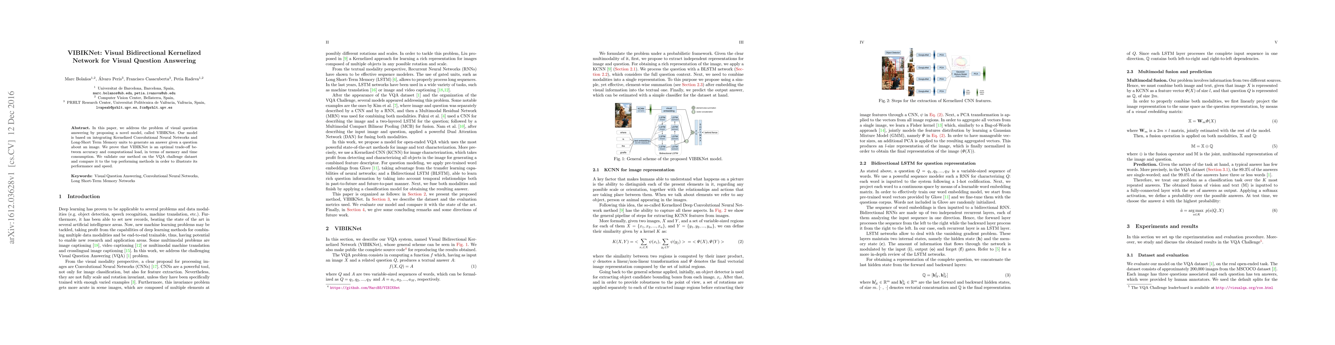 VIBIKNet integrates Kernelized Convolutional Neural Networks and Long-Short Term Memory units to efficiently answer visual questions based on images, demonstrating optimal balance between accuracy and computational efficiency compared to existing methods. The model is validated on the VQA challenge dataset, showcasing its performance and speed.