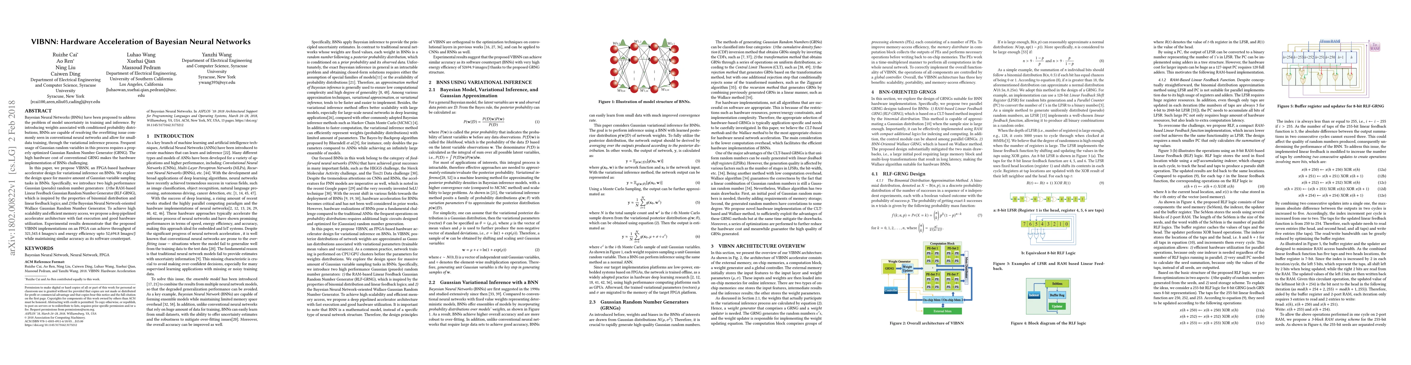 This paper proposes VIBNN, an FPGA-based hardware accelerator for variational inference on Bayesian Neural Networks, addressing the high hardware cost of conventional Gaussian Random Number Generators. It introduces two optimized GRNGs and a deep pipelined architecture, achieving high throughput and energy efficiency while maintaining accuracy.