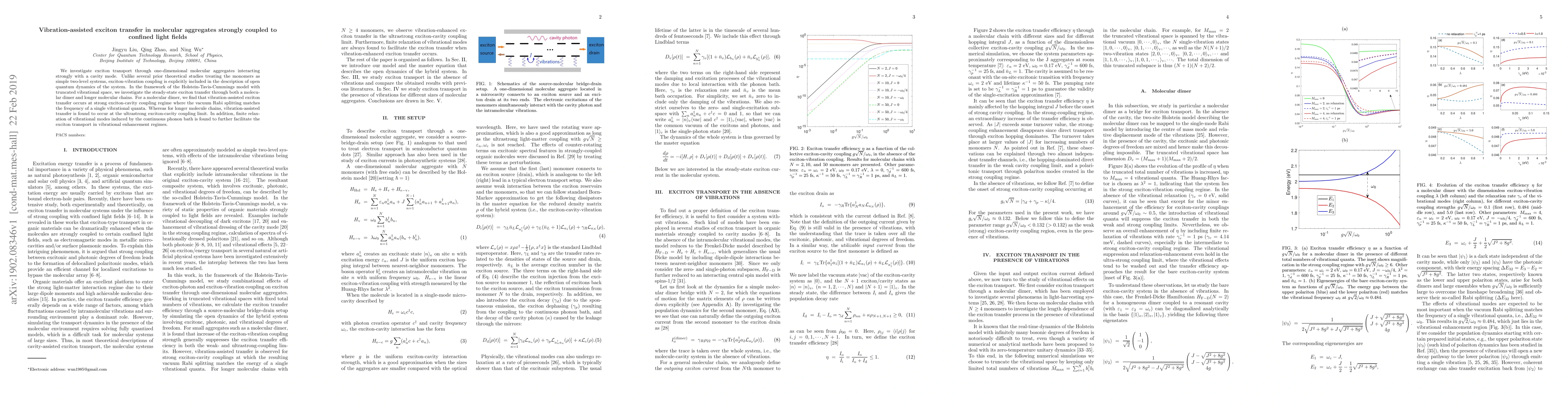 This paper explores exciton transport in molecular aggregates strongly coupled to confined light fields, emphasizing the role of exciton-vibration coupling. It finds that vibration-assisted exciton transfer is prominent in both dimers and longer chains, especially in ultrastrong coupling regimes, and that phonon bath-induced relaxation further enhances this transfer.