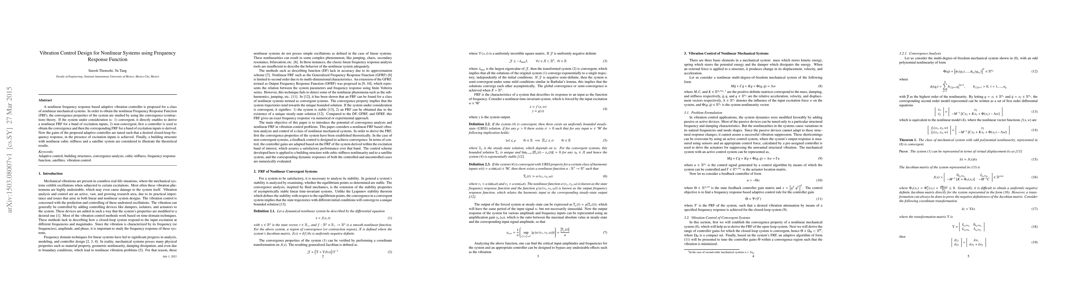 This paper proposes an adaptive vibration controller for nonlinear mechanical systems based on a nonlinear frequency response function. The controller is tuned for desired closed-loop frequency response, with theoretical results demonstrated through a building structure and a satellite system.