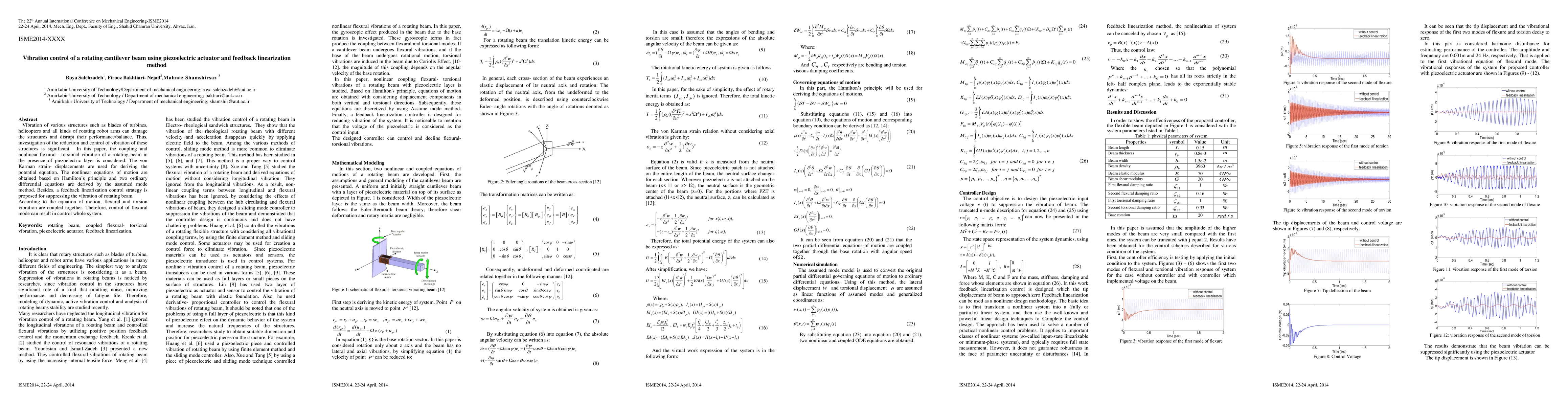 The vibration of various structures such as blades of turbines, helicopters, and all kinds of rotating robot arms can damage the structures and disrupt their performance and balance. Thus, investigation of the reduction and control of vibration of these structures is significant. In this paper, the coupled and nonlinear vibration of a rotating beam in the presence of the piezoelectric layer is considered. The Von Karman strain displacements are used for deriving the potential equation. The nonlinear equations of motion are obtained based on the Hamilton principle, and two ordinary differential equations are derived by the Assume Mode method. Besides, a feedback linearization control strategy is proposed for suppressing the vibration of the rotating beam. According to the equation of motion, flexural and torsional vibrations are coupled. Therefore, control of flexural mode can result in control of the whole system.