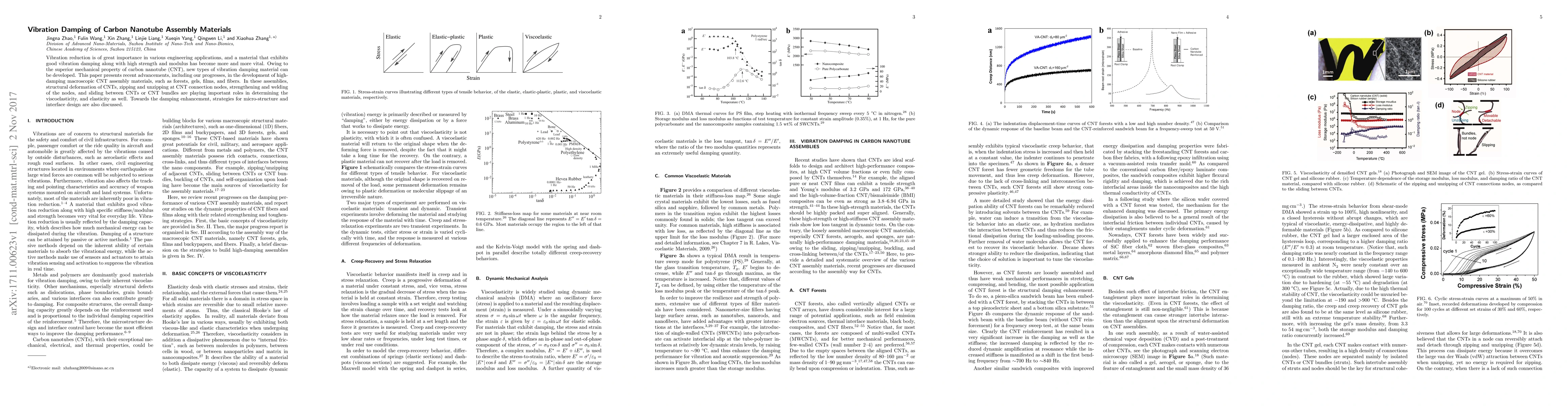 Vibration reduction is of great importance in various engineering applications, and a material that exhibits good vibration damping along with high strength and modulus has become more and more vital. Owing to the superior mechanical property of carbon nanotube (CNT), new types of vibration damping material can be developed. This paper presents recent advancements, including our progresses, in the development of high-damping macroscopic CNT assembly materials, such as forests, gels, films, and fibers. In these assemblies, structural deformation of CNTs, zipping and unzipping at CNT connection nodes, strengthening and welding of the nodes, and sliding between CNTs or CNT bundles are playing important roles in determining the viscoelasticity, and elasticity as well. Towards the damping enhancement, strategies for micro-structure and interface design are also discussed.
