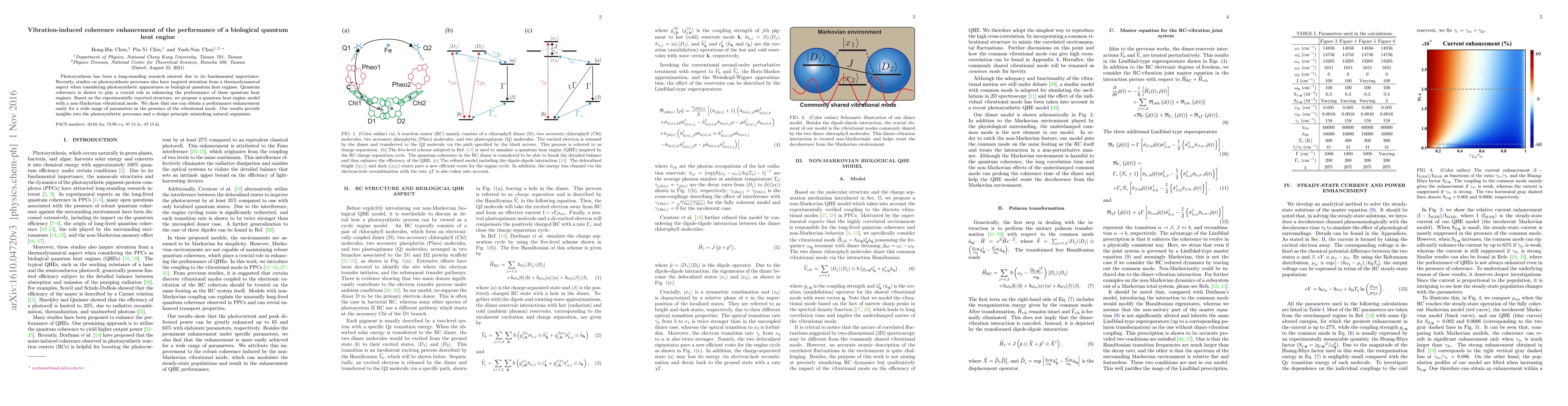 Photosynthesis has been a long-standing research interest due to its fundamental importance. Recently, studies on photosynthesis processes also have inspired attention from a thermodynamical aspect when considering photosynthetic apparatuses as biological quantum heat engines. Quantum coherence is shown to play a crucial role in enhancing the performance of these quantum heat engines. Based on the experimentally reported structure, we propose a quantum heat engine model with a non-Markovian vibrational mode. We show that one can obtain a performance enhancement easily for a wide range of parameters in the presence of the vibrational mode. Our results provide insights into the photosynthetic processes and a design principle mimicking natural organisms.