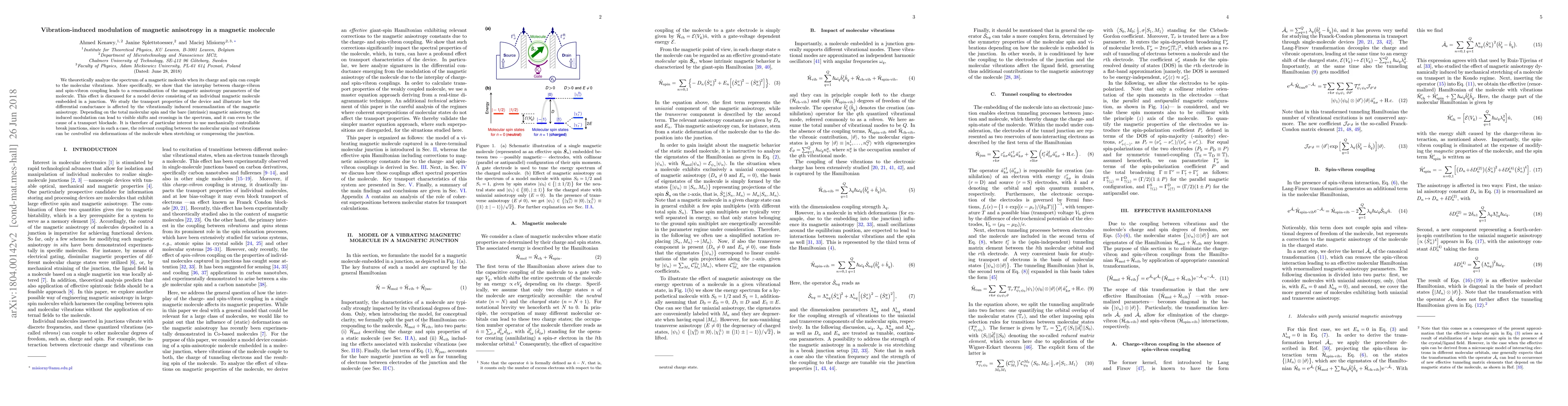 This paper theoretically investigates how molecular vibrations can modulate the magnetic anisotropy in a magnetic molecule, demonstrating that charge-vibron and spin-vibron couplings lead to changes in magnetic anisotropy parameters. The study also explores the resulting effects on transport properties, revealing potential shifts, crossings, or blockades in the spectrum that can be controlled via mechanical deformations in a junction.