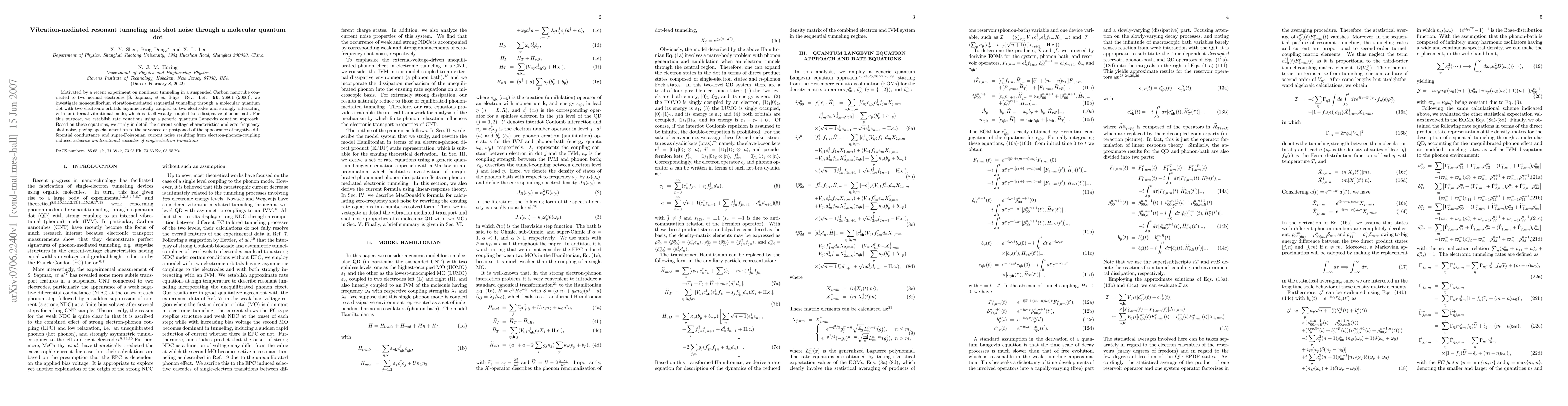 This paper explores nonequilibrium sequential tunneling through a molecular quantum dot influenced by internal vibrations, using a quantum Langevin equation approach. It investigates the current-voltage characteristics and shot noise, focusing on negative differential conductance and super-Poissonian noise due to selective unidirectional electron transitions induced by electron-phonon coupling.