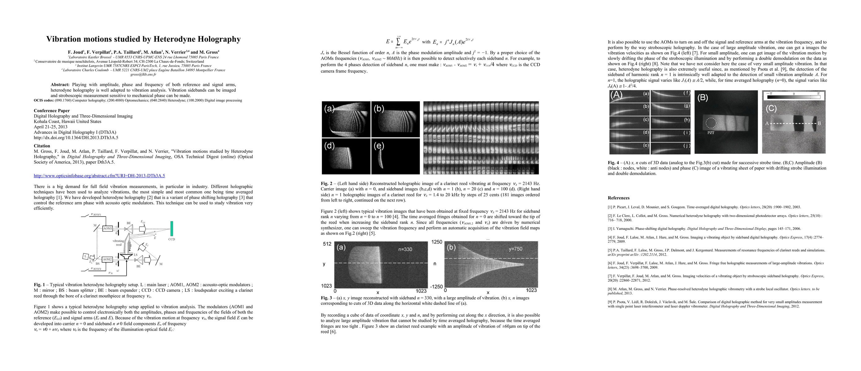 Playing with amplitude, phase and frequency of both reference and signal arms, heterodyne holography is well adapted to vibration analysis. Vibration sidebands can be imaged and stroboscopic measurement sensitive to mechanical phase can be made
