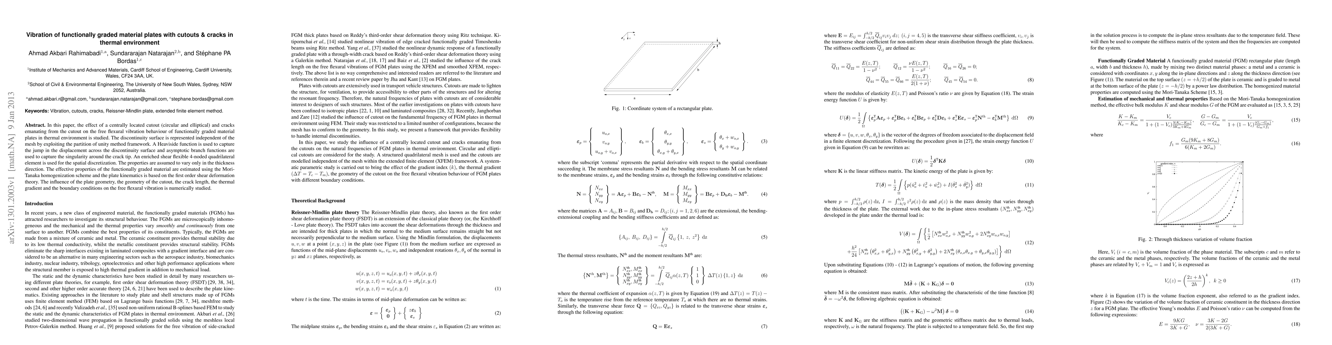 This paper investigates the free flexural vibration of functionally graded material plates with cutouts and cracks in thermal environments, employing a partition of unity method to model discontinuities. The study uses enriched elements to capture displacement jumps and singularities, and assesses the influence of various geometric and thermal factors.