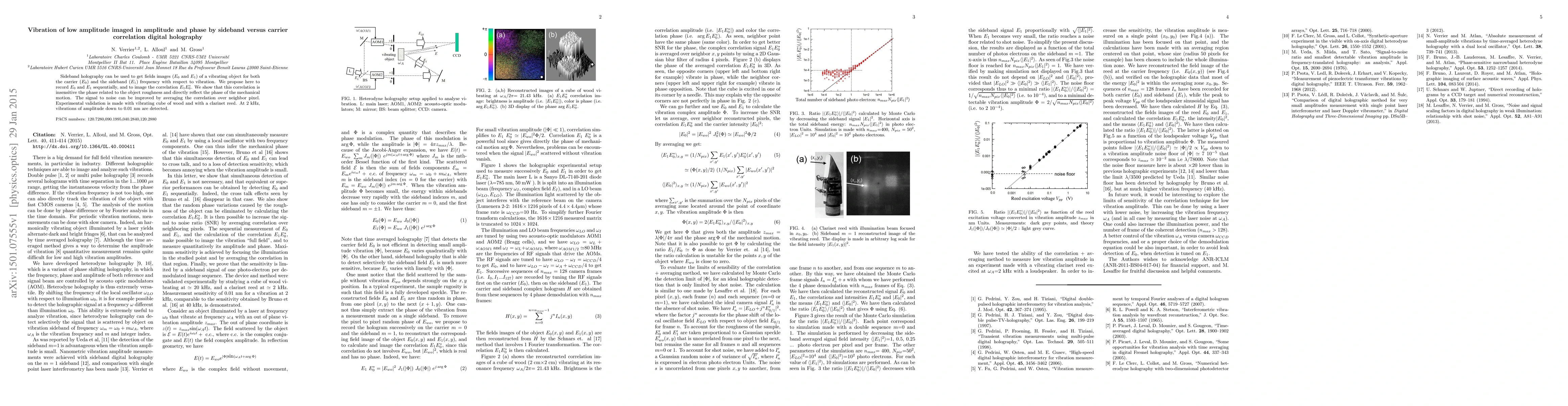 This paper proposes a method using sideband holography for imaging low amplitude vibrations by correlating the sideband and carrier frequencies, which improves signal-to-noise ratio and directly reflects mechanical motion phase, validated experimentally on a vibrating wood cube and clarinet reed at 2 kHz detecting vibrations as small as 0.01 nm.