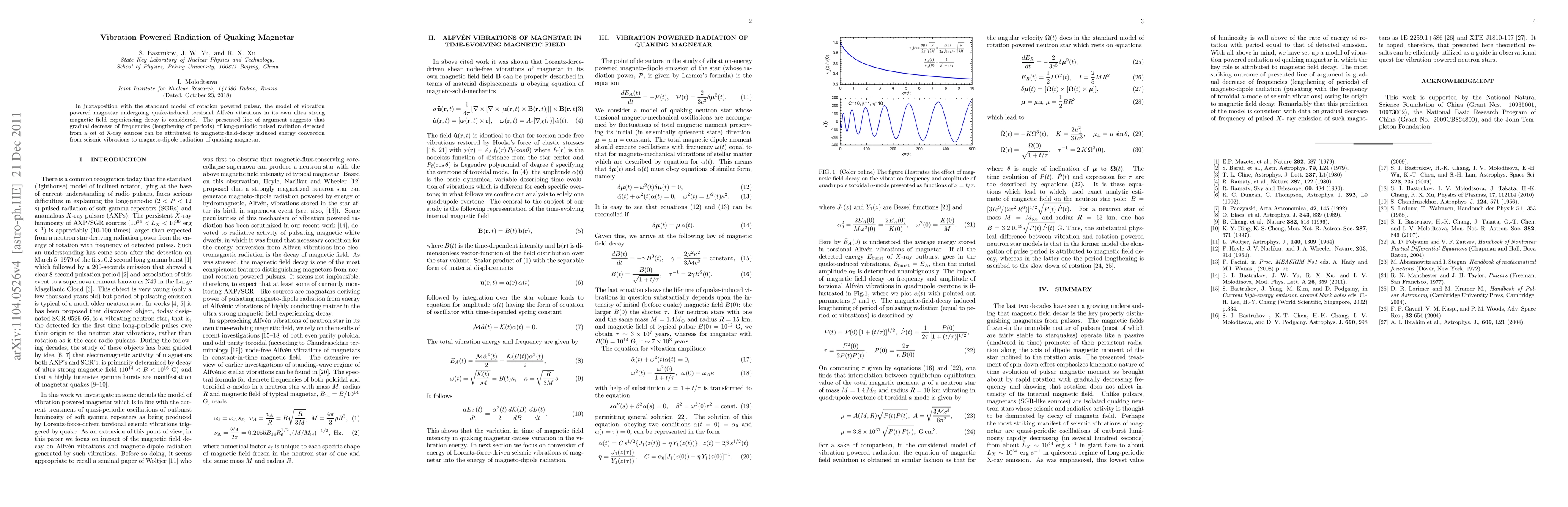 The paper proposes an alternative model to the standard pulsar energy source, suggesting that magnetars, not rotating, but vibrating due to magnetic field decay, emit radiation via Alfven vibrations converted into magneto-dipole radiation. This could explain the observed decrease in frequency of long-periodic X-ray pulses from certain sources.