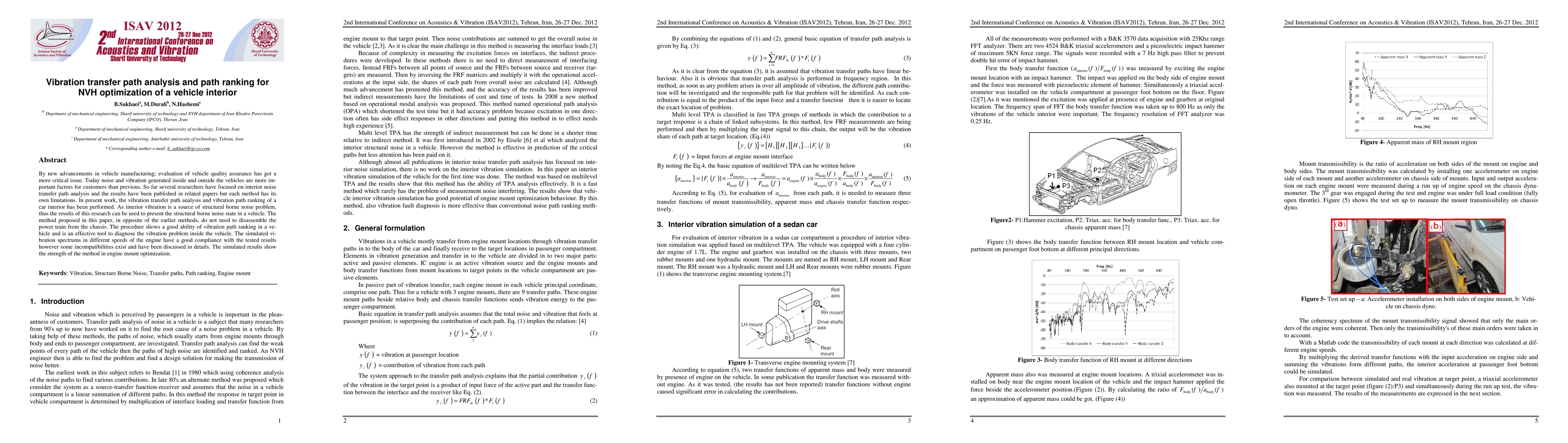 This paper proposes a method to analyze vibration transfer paths in a vehicle interior without disassembling the power train, providing a tool for diagnosing internal vibrations and optimizing engine mounts.