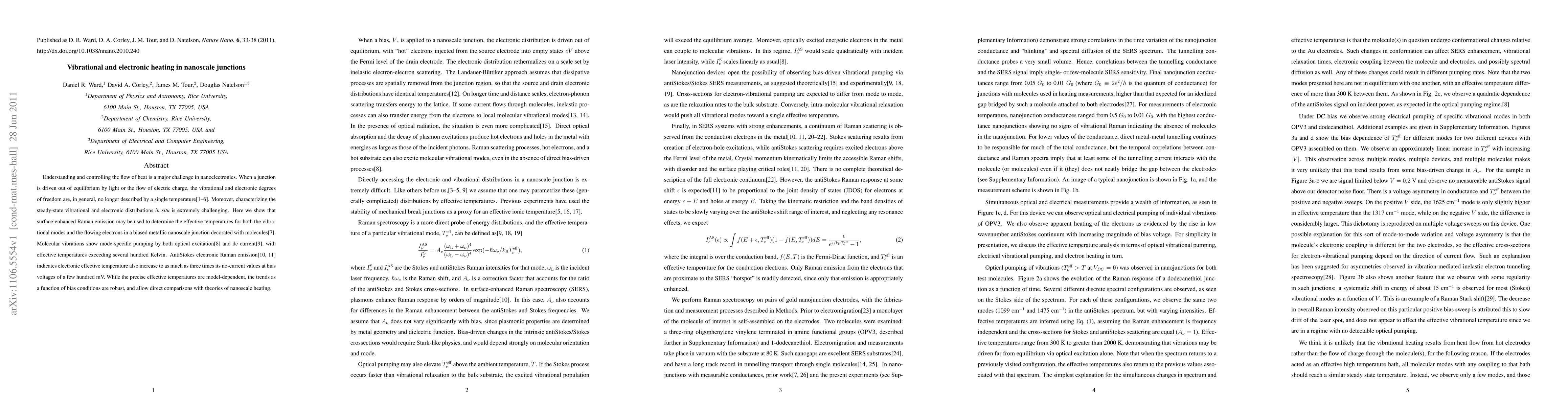 Understanding and controlling the flow of heat is a major challenge in nanoelectronics. When a junction is driven out of equilibrium by light or the flow of electric charge, the vibrational and electronic degrees of freedom are, in general, no longer described by a single temperature[1-6]. Moreover, characterizing the steady-state vibrational and electronic distributions {\it in situ} is extremely challenging. Here we show that surface-enhanced Raman emission may be used to determine the effective temperatures for both the vibrational modes and the flowing electrons in a biased metallic nanoscale junction decorated with molecules[7]. Molecular vibrations show mode-specific pumping by both optical excitation[8] and dc current[9], with effective temperatures exceeding several hundred Kelvin. AntiStokes electronic Raman emission\cite[10,11] indicates electronic effective temperature also increases to as much as three times its no-current values at bias voltages of a few hundred mV. While the precise effective temperatures are model-dependent, the trends as a function of bias conditions are robust, and allow direct comparisons with theories of nanoscale heating.