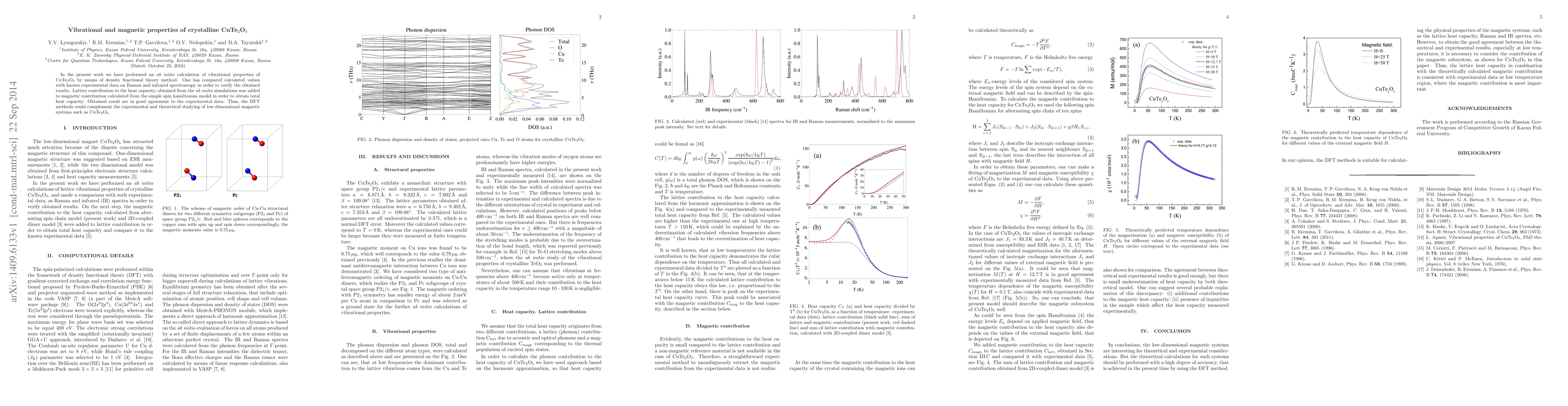 This study uses density functional theory to calculate the vibrational properties of CuTe2O5, comparing results with experimental Raman and infrared spectroscopy data. The total heat capacity, combining lattice and magnetic contributions, aligns well with experimental observations, demonstrating the efficacy of DFT methods in studying low-dimensional magnetic systems.
