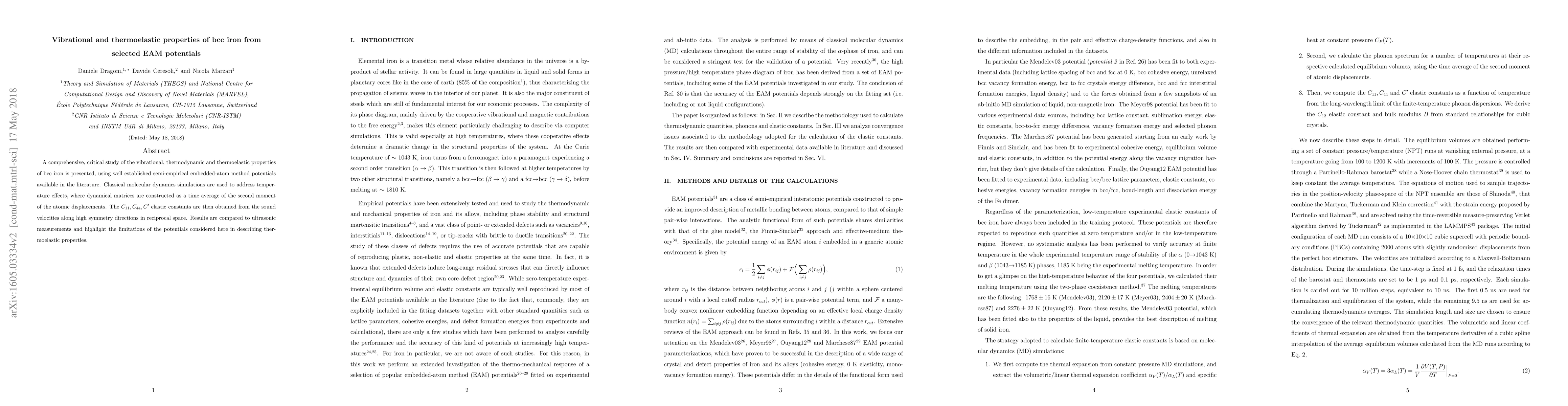 This study investigates the vibrational and thermoelastic properties of bcc iron using semi-empirical embedded-atom method potentials via classical molecular dynamics simulations. The research highlights the limitations of these potentials in accurately describing thermoelastic properties compared to ultrasonic measurements.