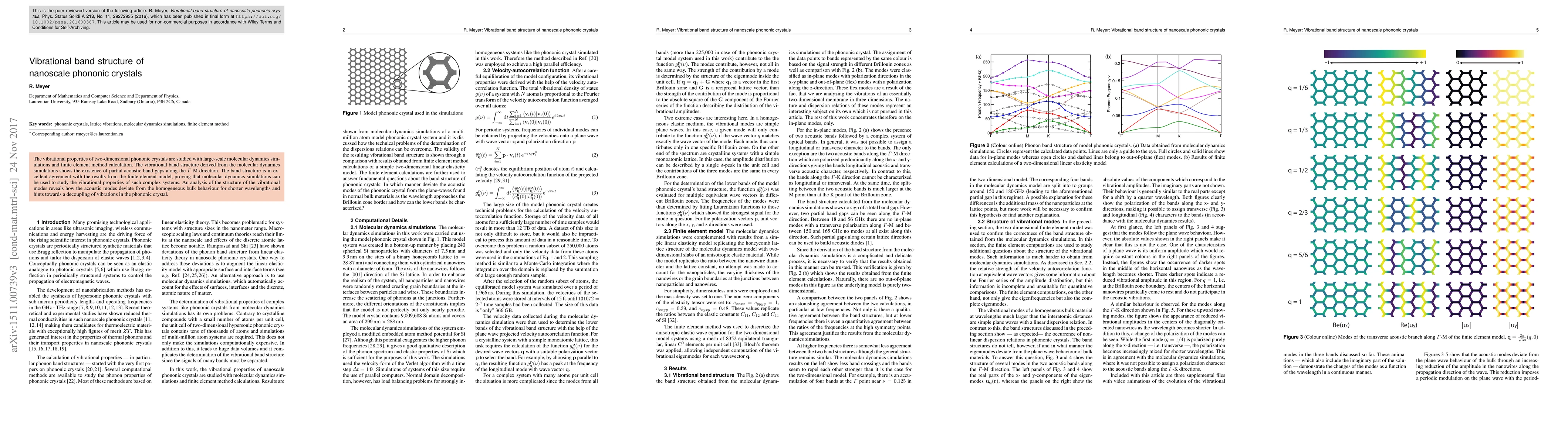 This study investigates the vibrational properties of two-dimensional phononic crystals using molecular dynamics simulations and finite element analysis, revealing partial acoustic band gaps and validating the use of molecular dynamics for complex systems, while showing acoustic mode deviations and potential vibration decoupling in nanoscale structures.