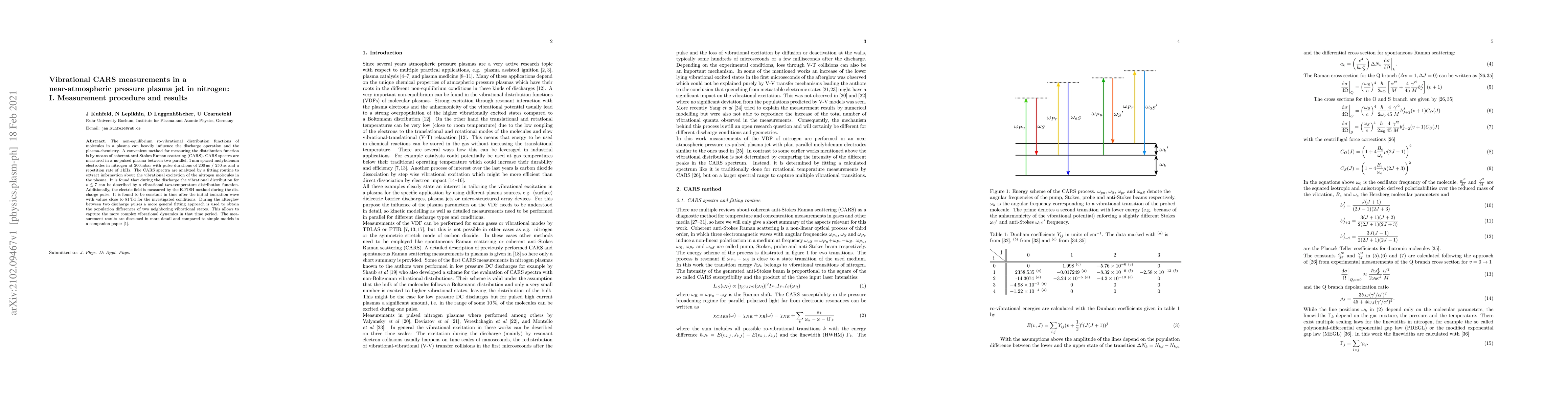 This study employs coherent anti-Stokes Raman scattering (CARS) to measure the ro-vibrational distribution functions of nitrogen molecules in a near-atmospheric pressure plasma jet, revealing a vibrational two-temperature distribution during the discharge. The electric field is also measured using E-FISH, showing stability after the initial ionization wave.