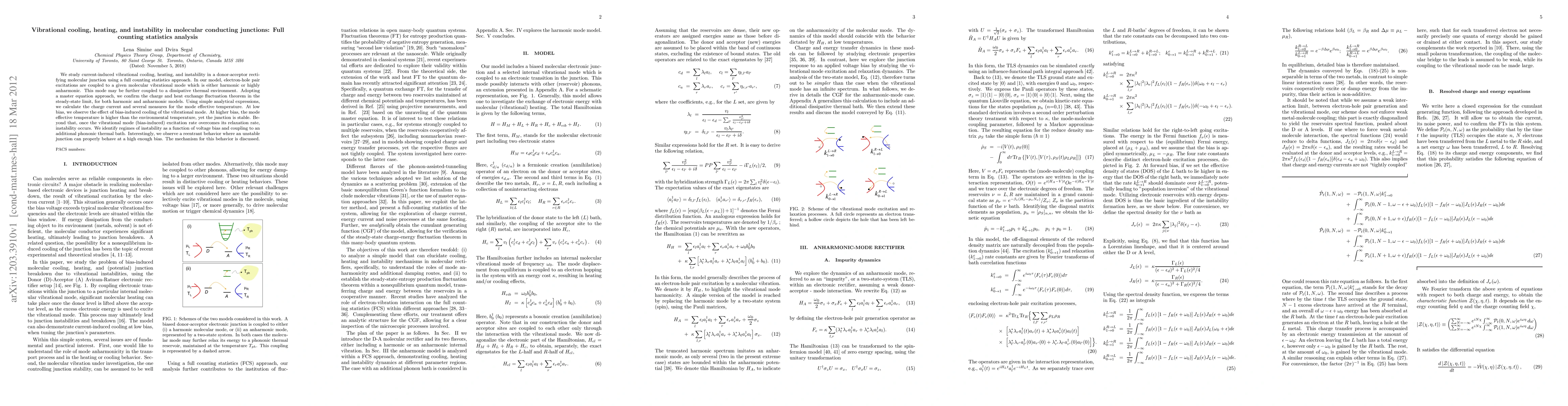 This paper investigates current-induced vibrational cooling, heating, and instability in molecular junctions using full counting statistics. It finds that low bias induces cooling, while higher bias leads to heating and potential instability, with a reentrant behavior observed at sufficiently high biases.