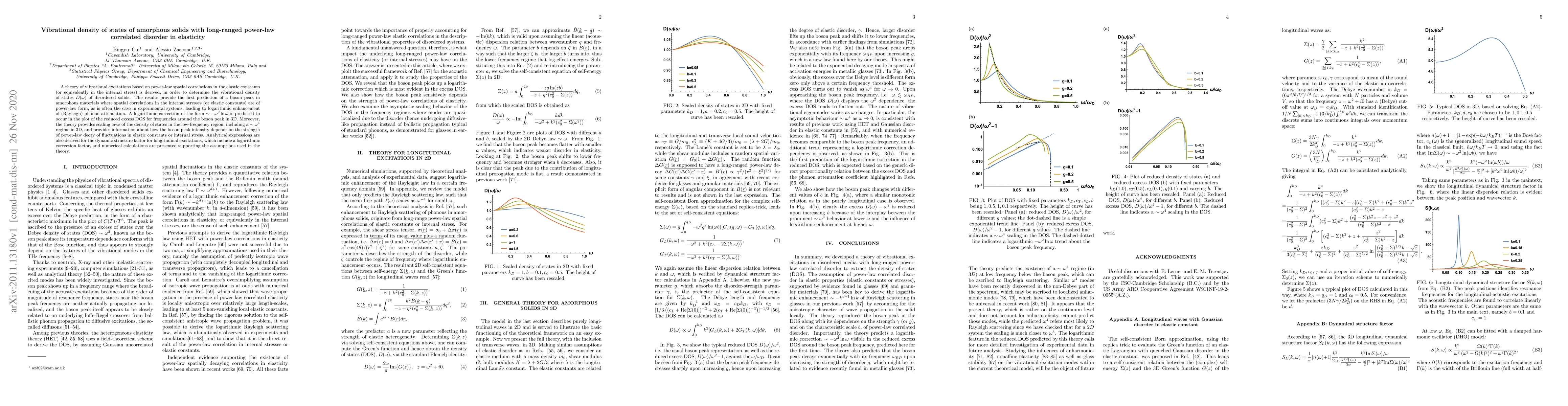 This paper develops a theoretical framework to analyze vibrational excitations in amorphous solids with long-ranged power-law correlated disorder, predicting a boson peak and logarithmic enhancement in phonon attenuation, along with scaling laws for the density of states in the low-frequency region. The theory also provides analytical expressions for the dynamic structure factor and is supported by numerical calculations.