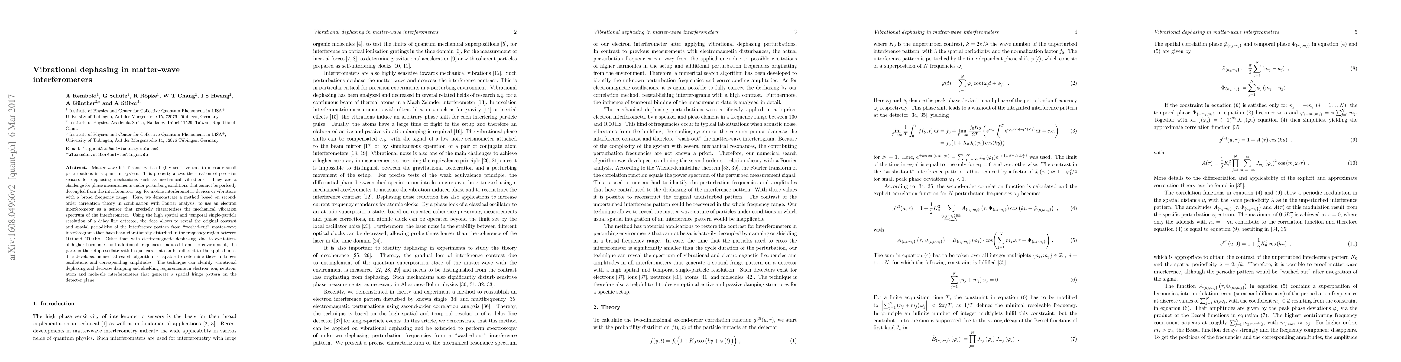 Matter-wave interferometry is a highly sensitive tool to measure small perturbations in a quantum system. This property allows the creation of precision sensors for dephasing mechanisms such as mechanical vibrations. They are a challenge for phase measurements under perturbing conditions that cannot be perfectly decoupled from the interferometer, e.g. for mobile interferometric devices or vibrations with a broad frequency range. Here, we demonstrate a method based on second-order correlation theory in combination with Fourier analysis, to use an electron interferometer as a sensor that precisely characterizes the mechanical vibration spectrum of the interferometer. Using the high spatial and temporal single-particle resolution of a delay line detector, the data allows to reveal the original contrast and spatial periodicity of the interference pattern from "washed-out" matter-wave interferograms that have been vibrationally disturbed in the frequency region between 100 and 1000 Hz. Other than with electromagnetic dephasing, due to excitations of higher harmonics and additional frequencies induced from the environment, the parts in the setup oscillate with frequencies that can be different to the applied ones. The developed numerical search algorithm is capable to determine those unknown oscillations and corresponding amplitudes. The technique can identify vibrational dephasing and decrease damping and shielding requirements in electron, ion, neutron, atom and molecule interferometers that generate a spatial fringe pattern on the detector plane.