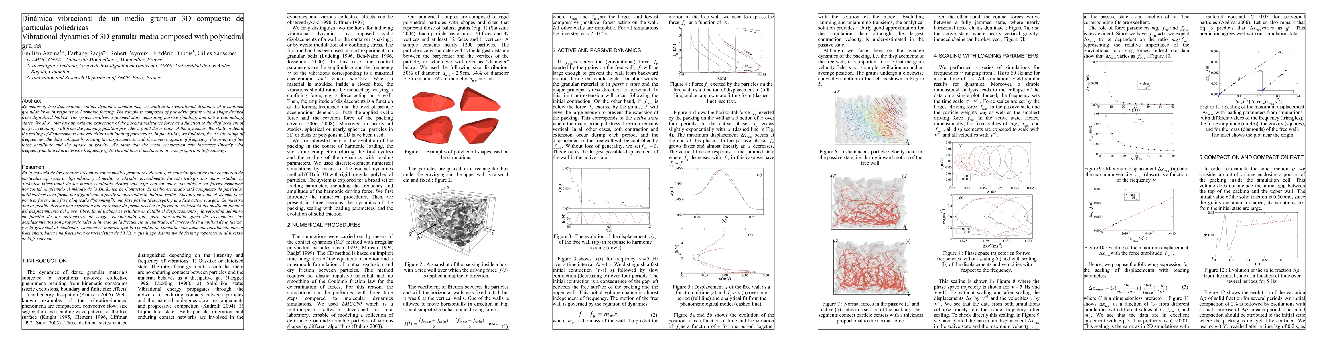 By means of tree-dimensional contact dynamics simulations, we analyze the vibrational dynamics of a confined granular layer in response to harmonic forcing. The sample is composed of polyedric grains with a shape derived from digitalized ballast. The system involves a jammed state separating passive (loading) and active (unloading) states. We show that an approximate expression of the packing resistance force as a function of the displacement of the free retaining wall from the jamming position provides a good description of the dynamics. We study in detail the scaling of displacements and velocities with loading parameters. In particular, we find that, for a wide range of frequencies, the data collapse by scaling the displacements with the inverse square of frequency, the inverse of the force amplitude and the square of gravity. We show that the mean compaction rate increases linearly with frequency up to a characteristic frequency of 10 Hz and then it declines in inverse proportion to frequency.