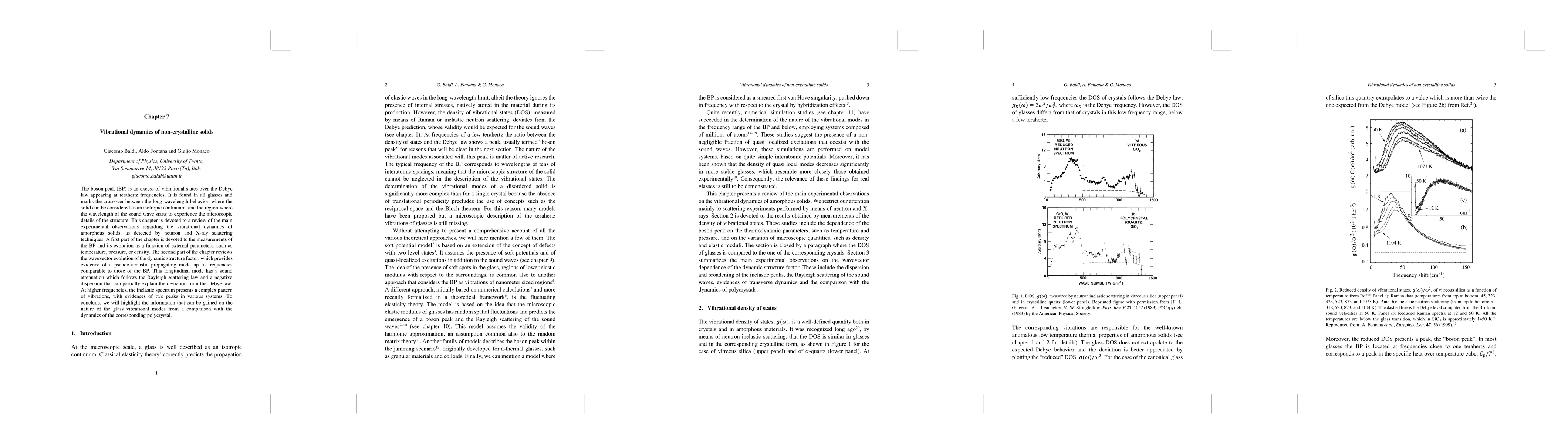 Research investigates the vibrational dynamics of non-crystalline solids, focusing on the boson peak and its evolution with temperature, pressure, and density. It reveals a pseudo-acoustic propagating mode that partially explains deviations from the Debye law.