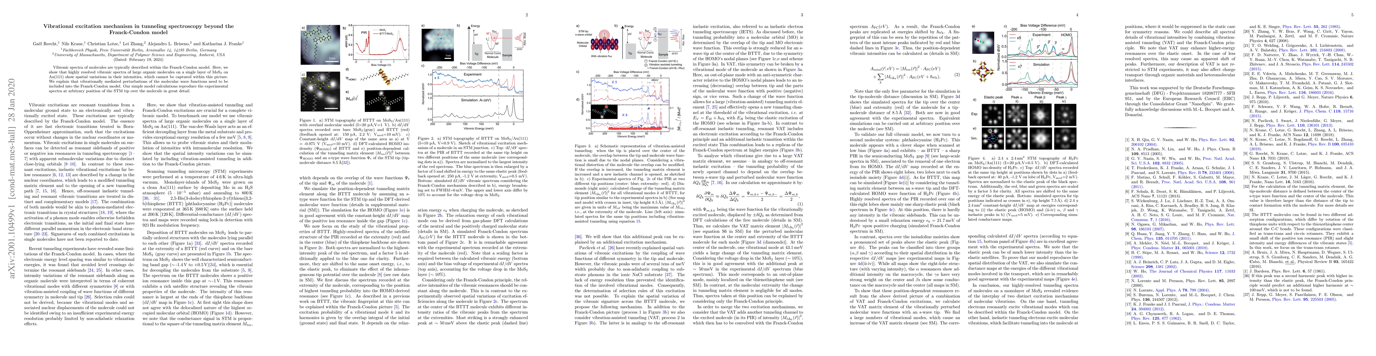 Researchers found that vibronic spectra of large molecules on a MoS2 surface deviate from the Franck-Condon model due to vibrationally mediated perturbations. Their simple model calculations accurately reproduce experimental results across different STM tip positions.