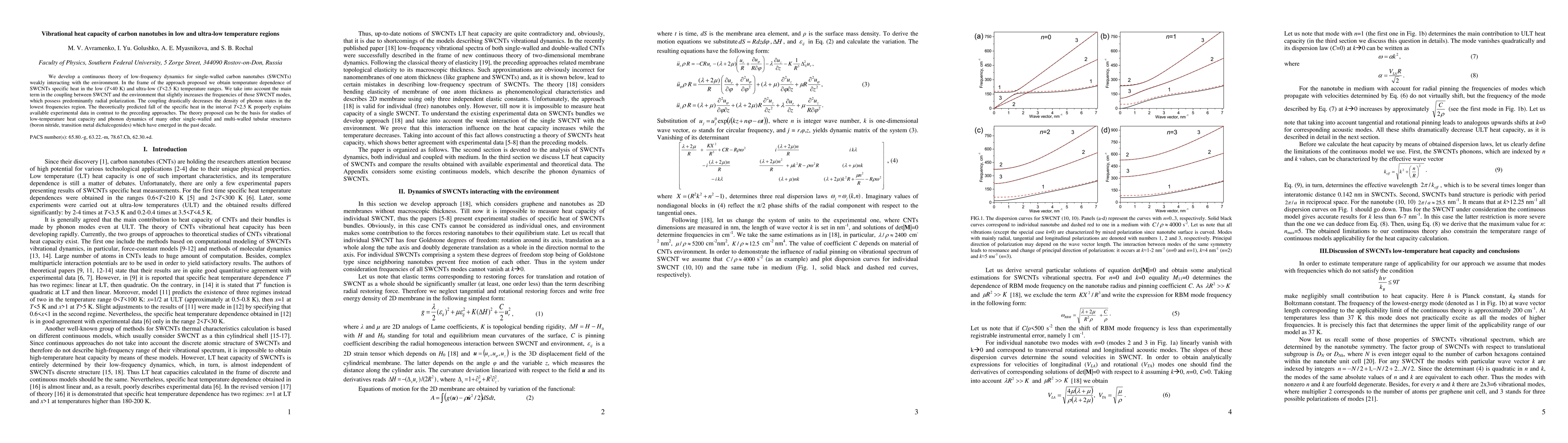 This paper develops a continuous theory for the low-frequency dynamics of single-walled carbon nanotubes, predicting their vibrational heat capacity in low and ultra-low temperature ranges. The theory accounts for environmental interactions, explaining the specific heat fall in the interval T<2.5 K and aligning with experimental data.