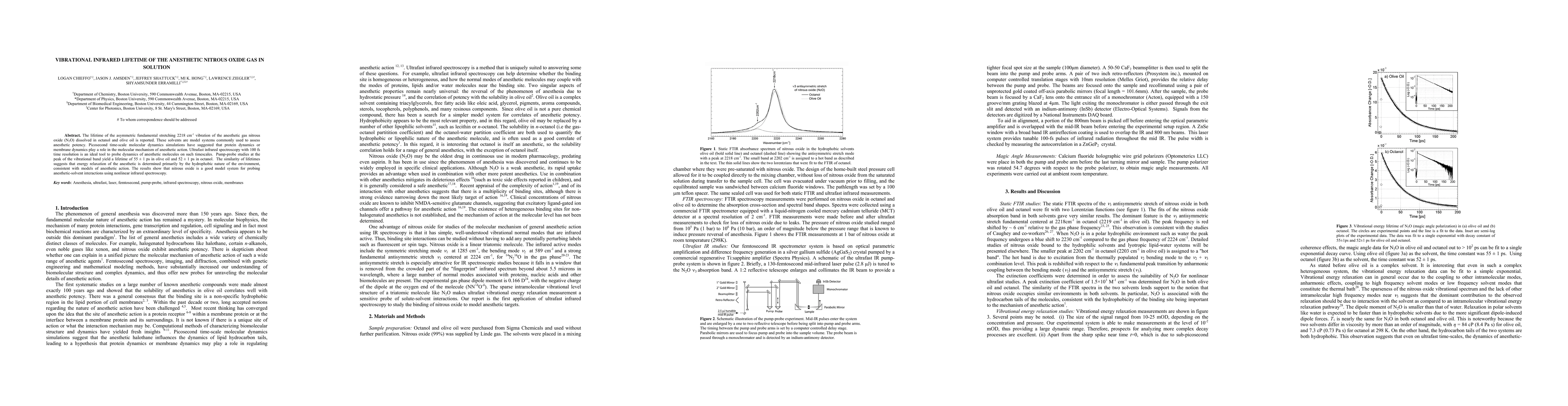 This study reports the vibrational infrared lifetime of nitrous oxide in octanol and olive oil, finding similar lifetimes of 55 ± 1 ps and 52 ± 1 ps respectively, indicating that the anesthetic's energy relaxation is mainly influenced by the hydrophobic solvent environment. These findings support the use of nitrous oxide as a model for studying anesthetic-solvent interactions.
