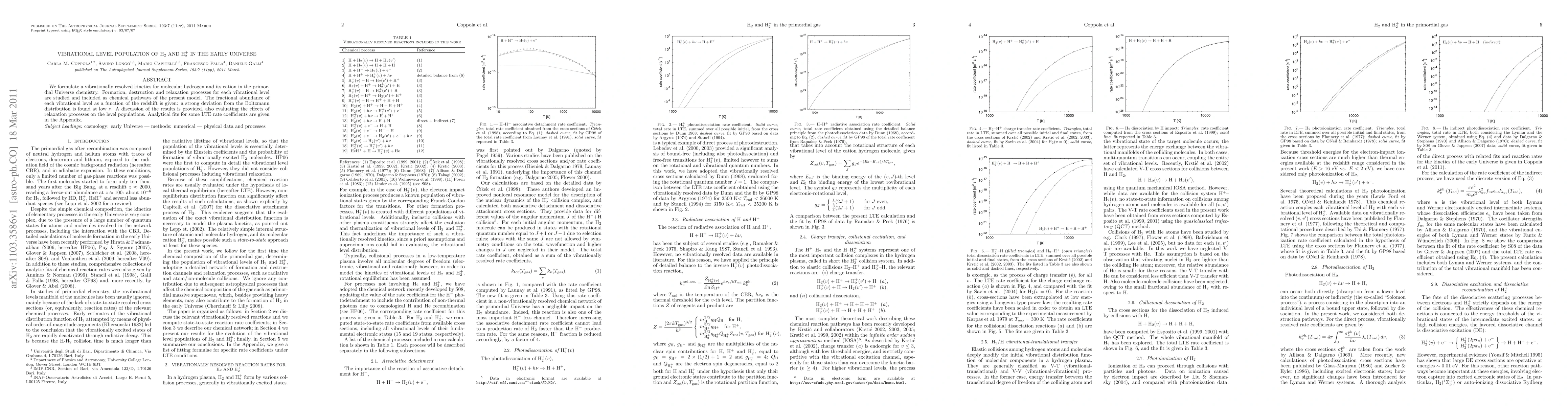 We formulate a vibrationally resolved kinetics for molecular hydrogen and its cation in the primordial Universe chemistry. Formation, destruction and relaxation processes for each vibrational level are studied and included as chemical pathways of the present model. The fractional abundance of each vibrational level as a function of the redshift is given: a strong deviation from the Boltzmann distribution is found at low $z$. A discussion of the results is provided, also evaluating the effects of relaxation processes on the level populations. Analytical fits for some LTE rate coefficients are given in the Appendix.