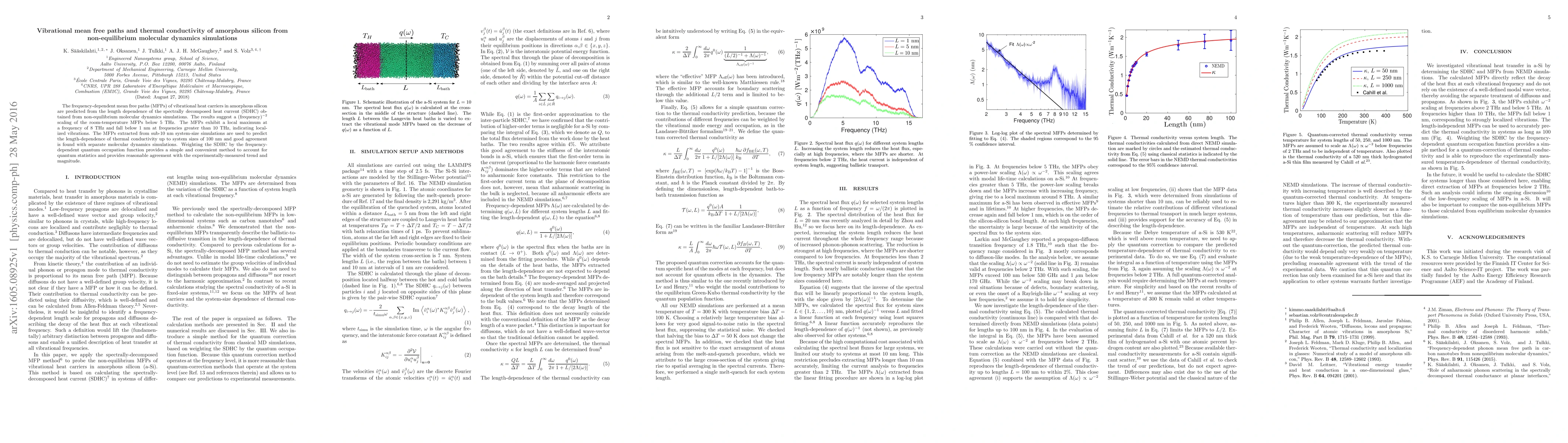 The frequency-dependent mean free paths (MFPs) of vibrational heat carriers in amorphous silicon are predicted from the length dependence of the spectrally decomposed heat current (SDHC) obtained from non-equilibrium molecular dynamics simulations. The results suggest a (frequency)$^{-2}$ scaling of the room-temperature MFPs below 5 THz. The MFPs exhibit a local maximum at a frequency of 8 THz and fall below 1 nm at frequencies greater than 10 THz, indicating localized vibrations. The MFPs extracted from sub-10 nm system-size simulations are used to predict the length-dependence of thermal conductivity up to system sizes of 100 nm and good agreement is found with separate molecular dynamics simulations. Weighting the SDHC by the frequency-dependent quantum occupation function provides a simple and convenient method to account for quantum statistics and provides reasonable agreement with the experimentally-measured trend and magnitude.